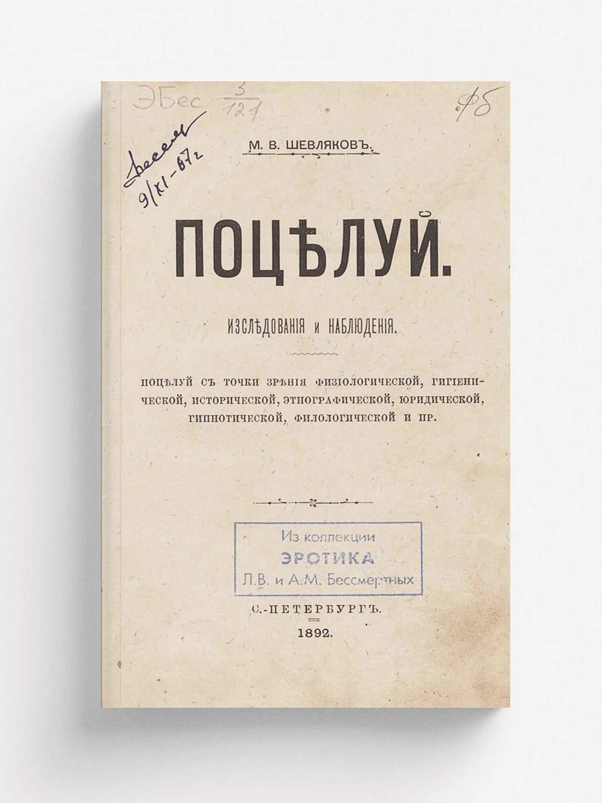 Шевляков, Михаил Викторович (1865–1913). Поцелуй. Исследования и наблюдения (Поцелуй с точки зрения физиологической, гигиенической, исторической, этнографической, юридической, гипнотической, филологической и пр.) / М. В. Шевляков. — Санкт-Петербург : тип. Трунова, 1892. — III, 248 с.; 19.