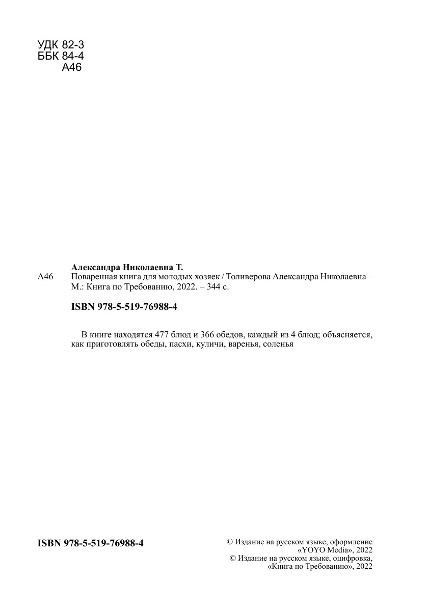 Печатная книга «Поваренная книга для молодых хозяек» в мягкой обложке, язык - русский. В книге 344 страниц, она напечатана на белой офсетной бумаге плотностью 80 г/м². Формат издания — 148x210 мм. Все книги аккуратно упаковываем в прочный трёхслойный непрозрачный картонный конверт.