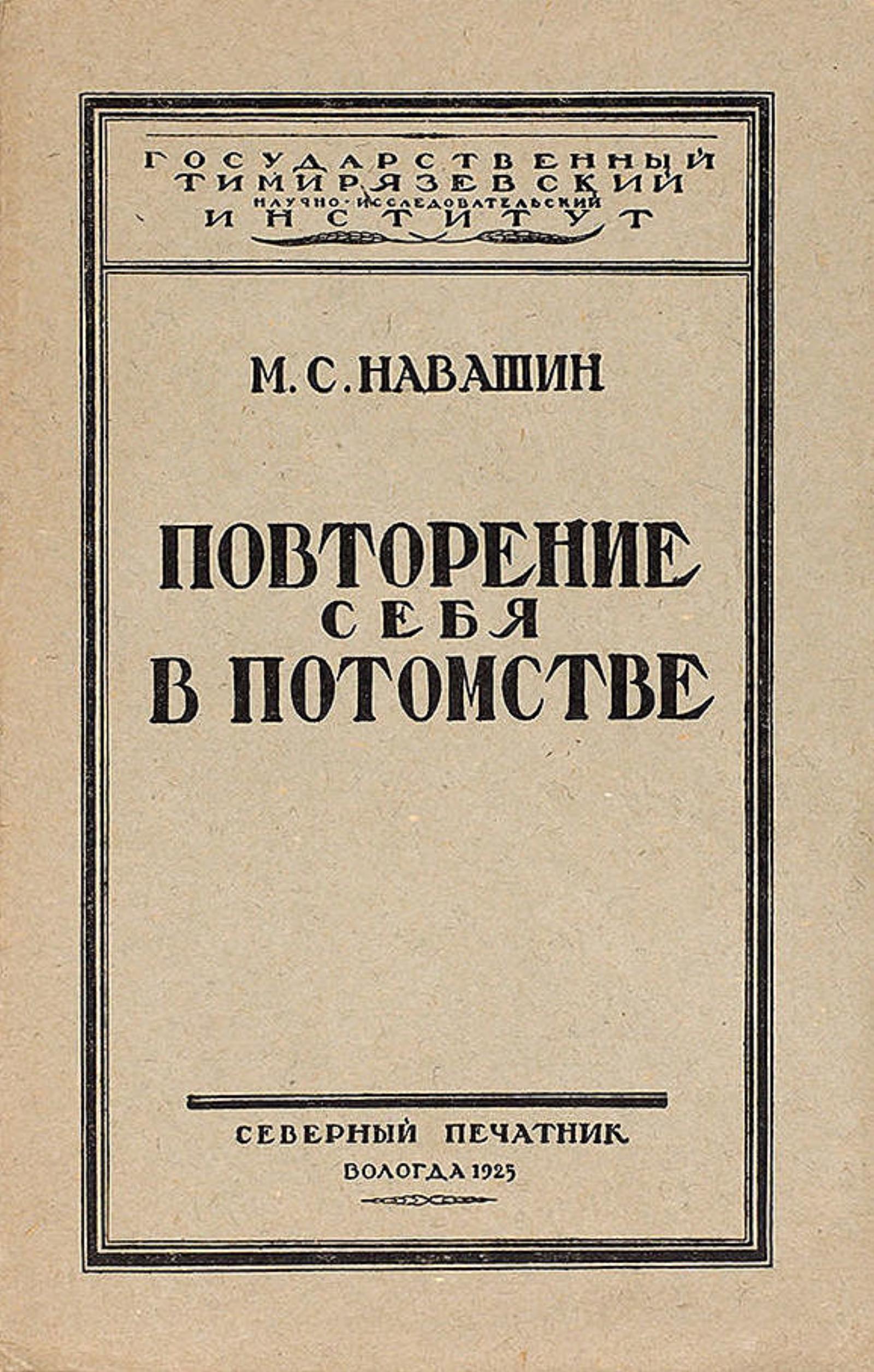 Навашин, Михаил Сергеевич. Повторение себя в потомстве / М. С. Навашин. — Вологда : Северный печатник, 1925. — 77 с., 10 ил.; 18 см. — (Серия 9. «На пути к материализму». (Пособия для учителя и самообразования)/ Гос. Тимирязевск. науч.-исслед. ин-т изучения и пропаганды естественно-науч. основ диалектич. материализма; Вып. № 6).