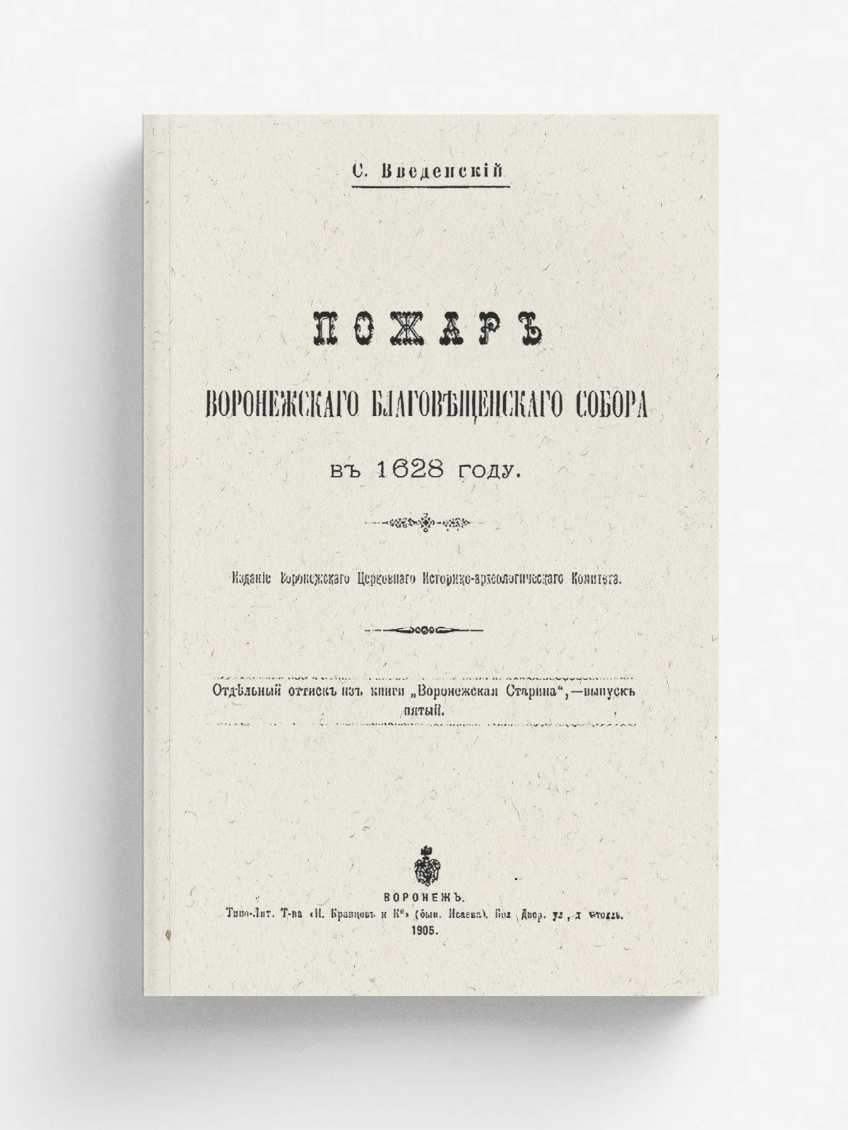 Введенский, Сергей Николаевич (1867–). Пожар Воронежского Благовещенского собора в 1628 году / С. Введенский. — Воронеж : Воронежск. церковный историко-археологич. ком-т, 1905. — 7 с.; 24.