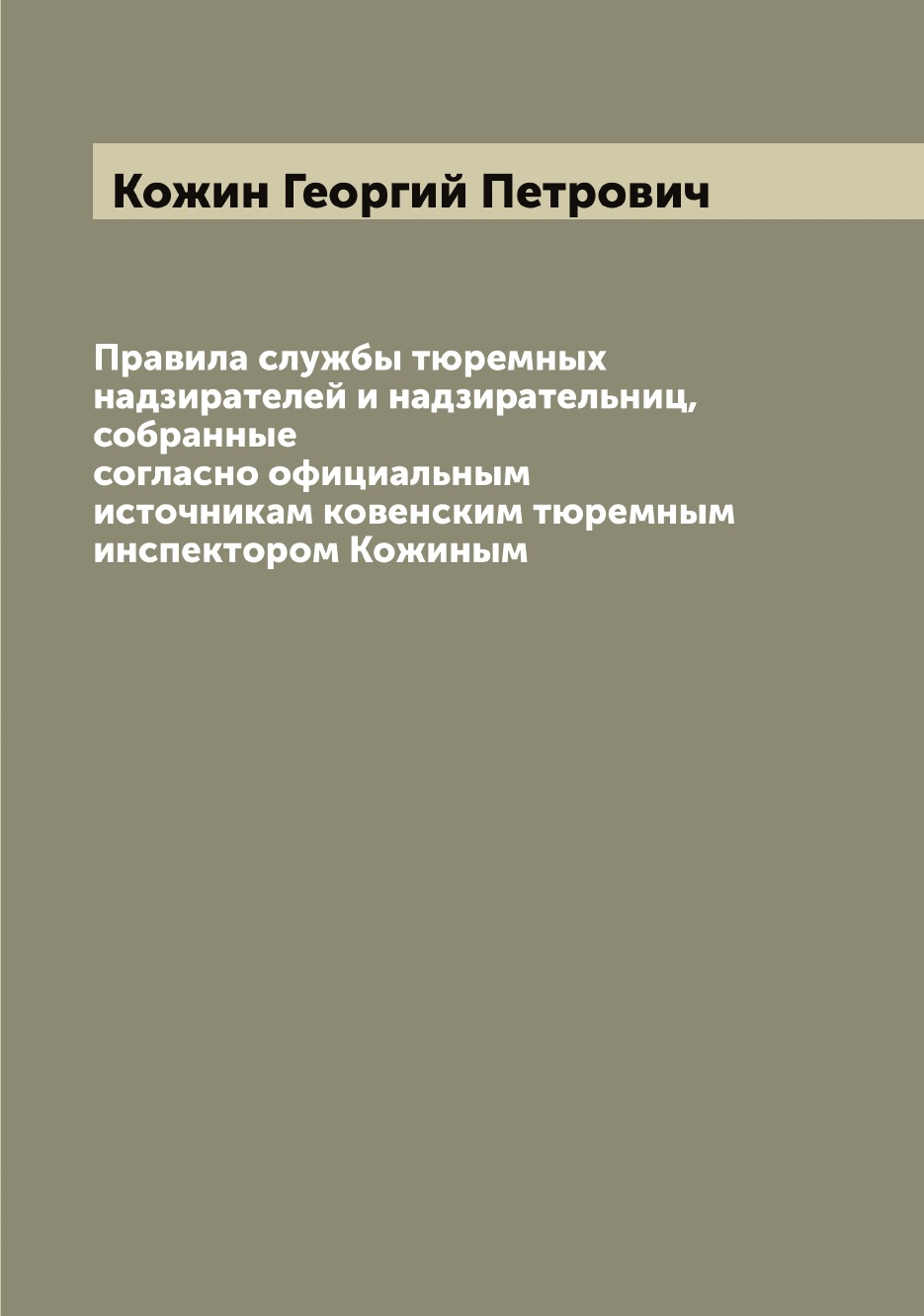 Печатная книга «Правила службы тюремных надзирателей и надзирательниц, собранные согласно официальным источникам ковенским тюремным инспектором Кожиным» в мягкой обложке, язык - русский. В книге 63 страниц, она напечатана на белой офсетной бумаге плотностью 80 г/м². Формат издания — 165x235 мм. Все книги аккуратно упаковываем в прочный трёхслойный непрозрачный картонный конверт.