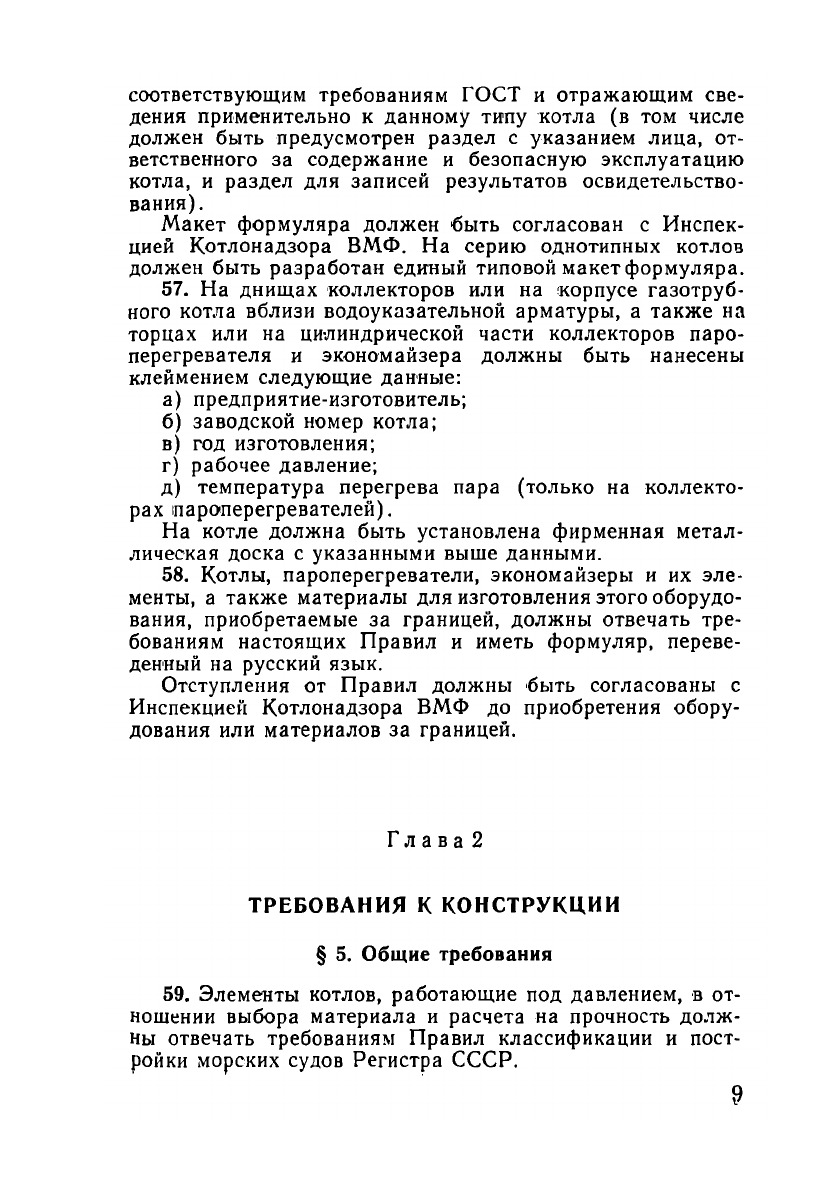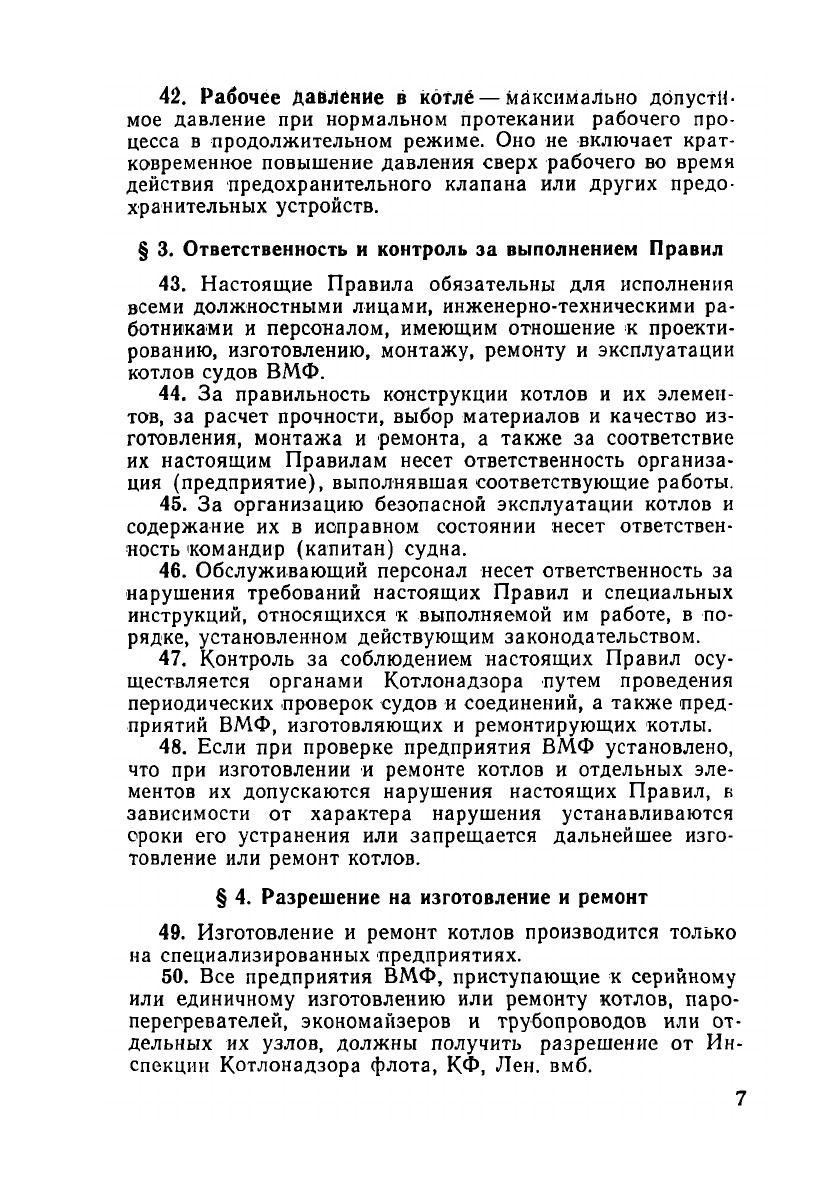 Настоящие Правила содержат требования к устройству, изготовлению, сборке, эксплуатации и ремонту паровых и водогрейных котлов (включая пароперегреватели и экономайзеры), а также трубопроводов судов ВМФ.Правила распространяются:1) на паровые котлы (в том числе утилизационные) с рабочим давлением 0,7 кгс/см2 [0,07 МПа] и более;2) на водогрейные котлы с температурой подогрева воды выше 115°С;3) на трубопроводы, обеспечивающие работу котлов:- паропроводы;- трубопроводы продувания;- систему питательной воды.Настоящие Правила разработаны с учетом требований Правил классификации и постройки морских судов Регистра СССР, Правил эксплуатации котельных установок кораблей ВМФ и особенностей судов ВМФ.