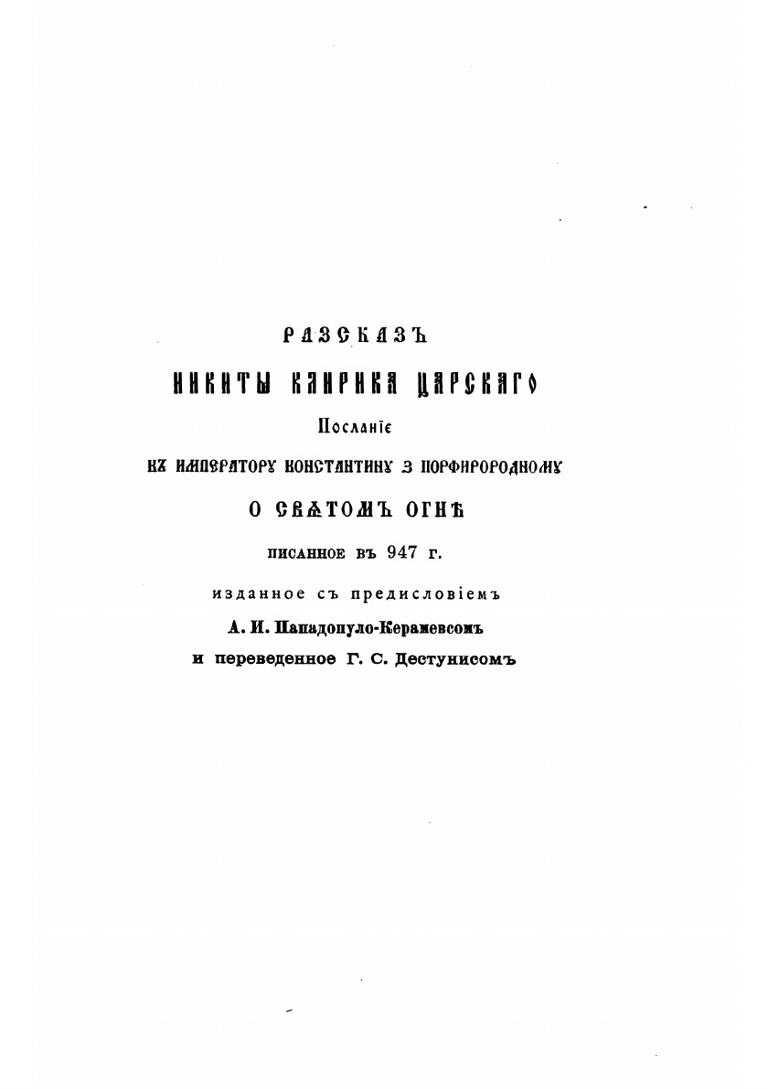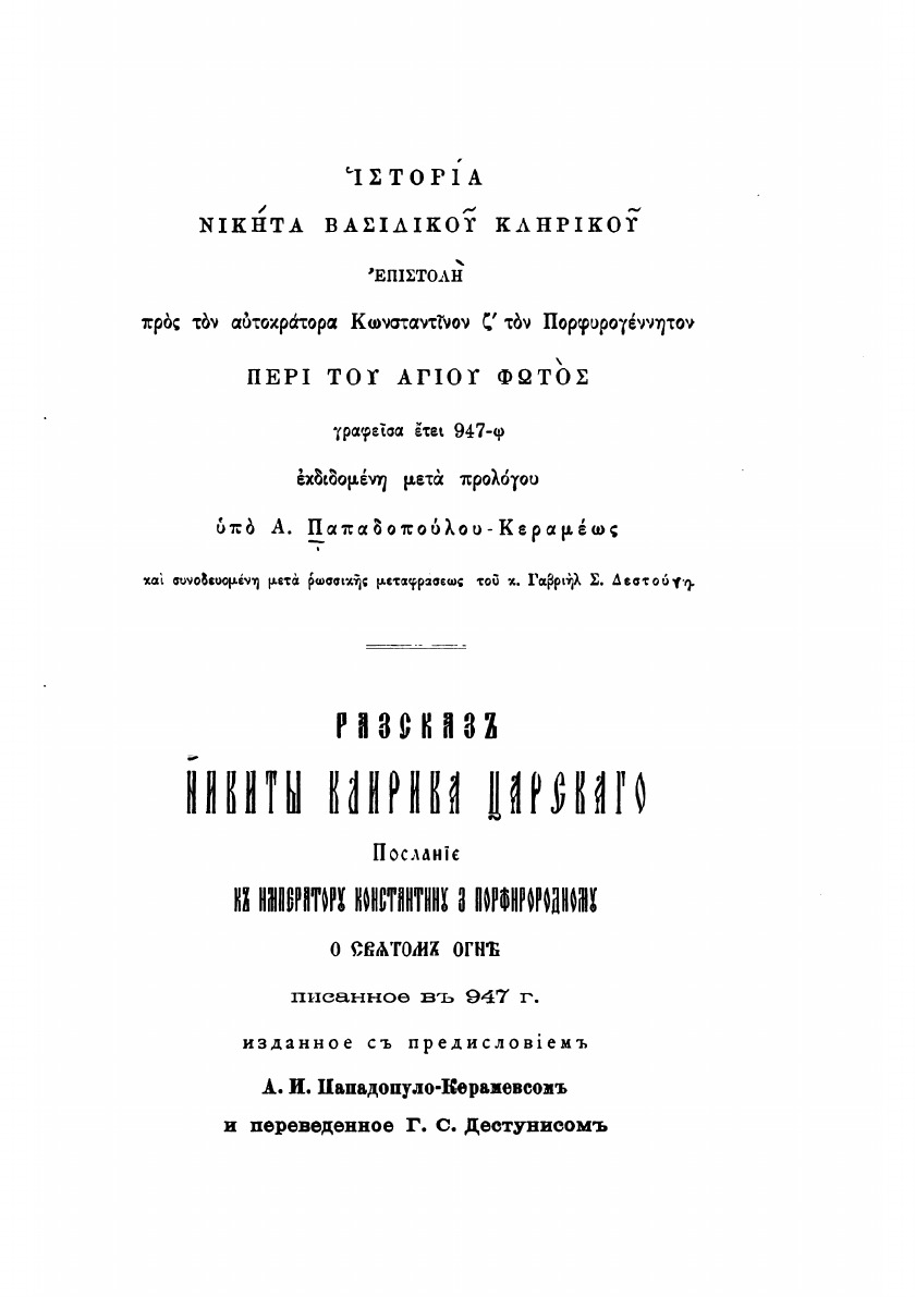 Рассказ Никиты, клирика царского. Послание к императору Константину VII Порфирородному о Святом Огне