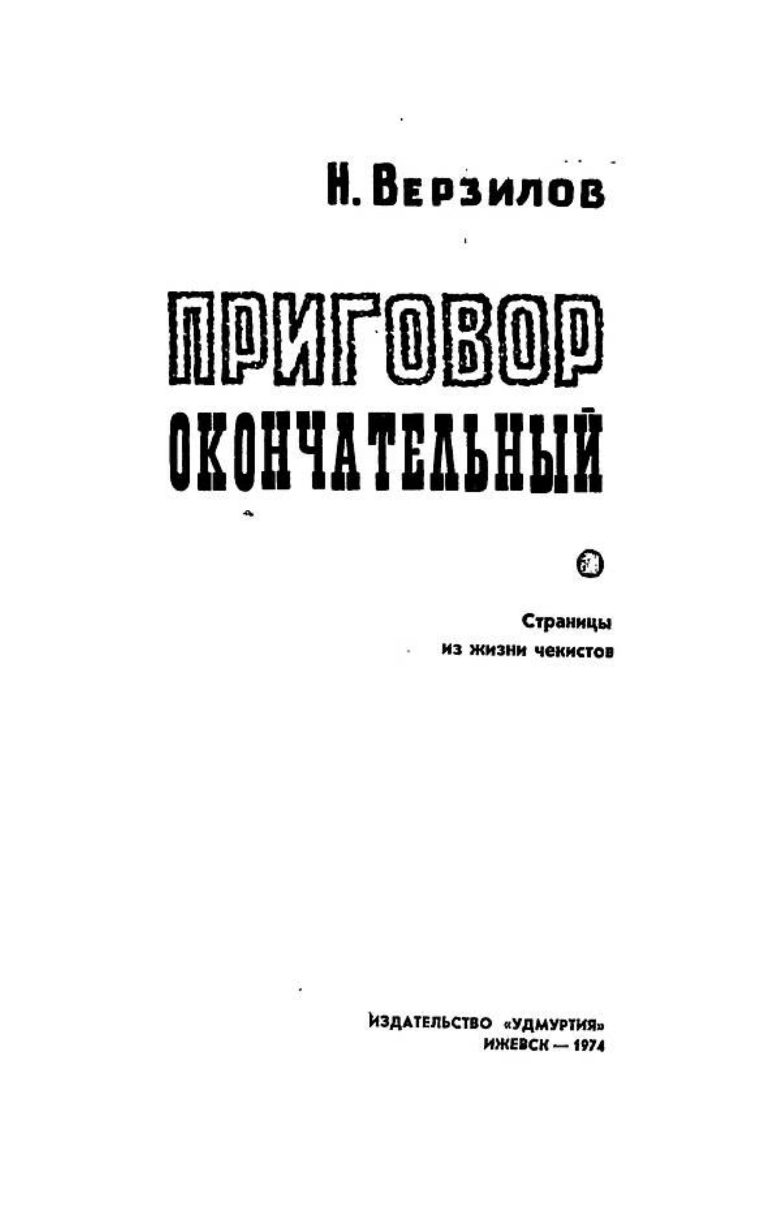 Верзилов, Николай Николаевич. Приговор окончательный : Страницы из жизни чекистов. — Ижевск : Удмуртия, 1974. — 172 с.; 20 см.