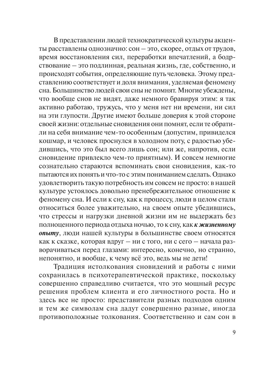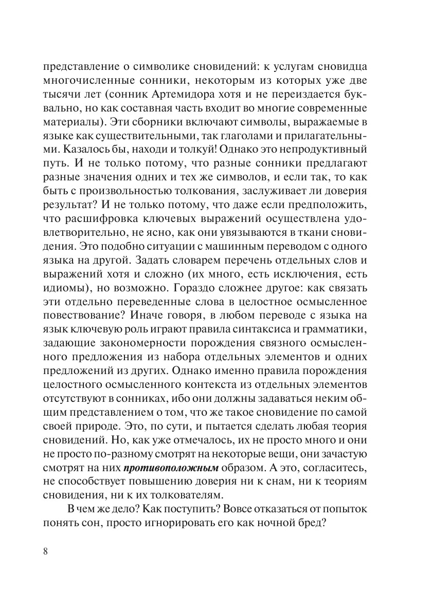 В книге прослеживаются особенности отношения к сновидениям, сложившиеся в разные исторические эпохи в разных сообществах, включая традиционные примитивные культуры. Специальное внимание уделяется техническим характеристикам сна и сновидения, полученным в рамках многочисленных исследовательских программ в нейрофизиологии, медицине, психологии. Автор формулирует модель, в которой сновидение предстает как форма проявления отношений, существующих между человеком и глубинной реальностью. Из этого методологического положения вытекает ряд интересных выводов относительно места и роли феномена сновидения в жизни человека.
