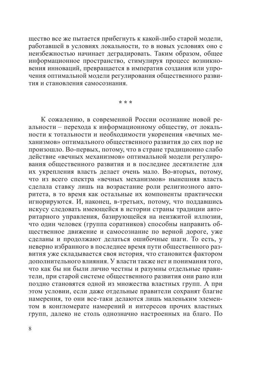 В книге публикуются материалы 4-й конференции ИФ РАН по проблемам российского самосознания, проведенной совместную с регионами в мае 2009 г. в Москве и Белгороде. Рассматриваются вопросы, связанные с пониманием взаимодействия архаической, традиционной и инновационной компоненты отечественного самосознания в исторической ретроспективе и с точки зрения современной трансформации российского общества.