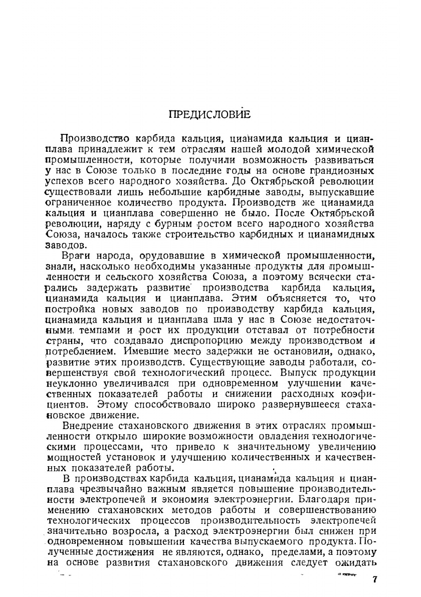 Производство карбида кальция, цианамида кальция и цианплава принадлежит к тем отраслям нашей молодой химической промышленности, которые получили возможность развиваться в Союзе только в последние годы на основе грандиозных успехов всего народного хозяйства. До Октябрьской революции существовали лишь небольшие карбидные заводы, выпускавшие ограниченное количество продукта. Производств же цианамида кальция и цианплава совершенно не было. После Октябрьской революции, наряду с бурным ростом всего народного хозяйства Союза, началось также строительство карбидных и цианамидных заводов. Книга представляет собой учебное пособие по техминимуму дли рабочих, занятых а производствах карбида кальция, цианамида кальция и цианплава. В книге описываются технологический процесс, конструкции аппаратов, применяемых в перечисленных производствах, и их обслуживание, а также условия, обеспечивающие нормальную работу аппаратов. Большое внимание уделено контролю производства и технике безопасности. Каждый раздел книги имеет вводную теоретическую часть