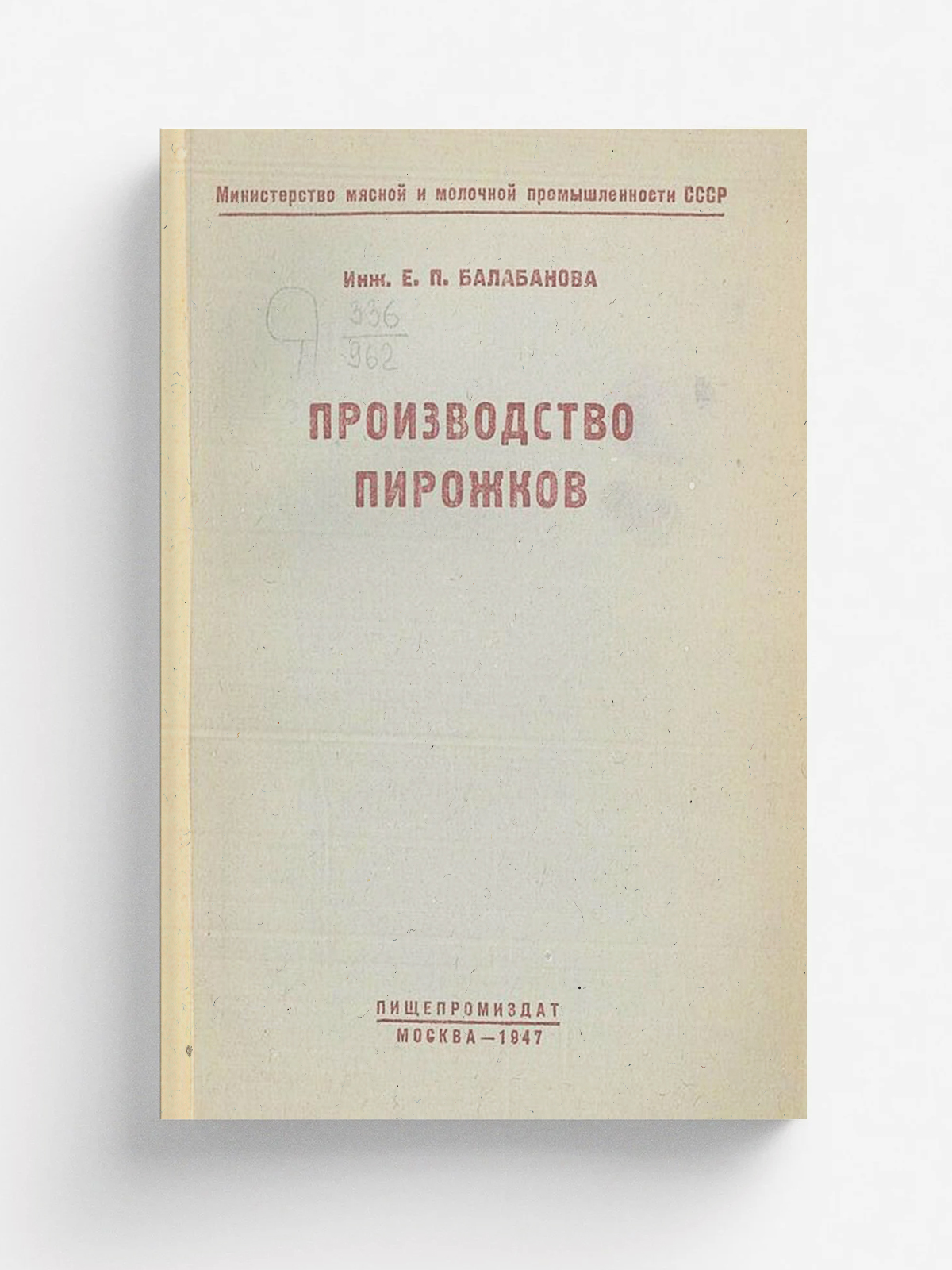 Балабанова, Елена Петровна. Производство пирожков / Инж. Е. П. Балабанова; М-во мяс. и молоч. пром-сти СССР. — Москва: Пищепромиздат, 1947 (типолитогр. М-ва мяс. и молоч. пром-сти СССР). — 100 с., 2 л. черт. : ил., черт.; 18 см.