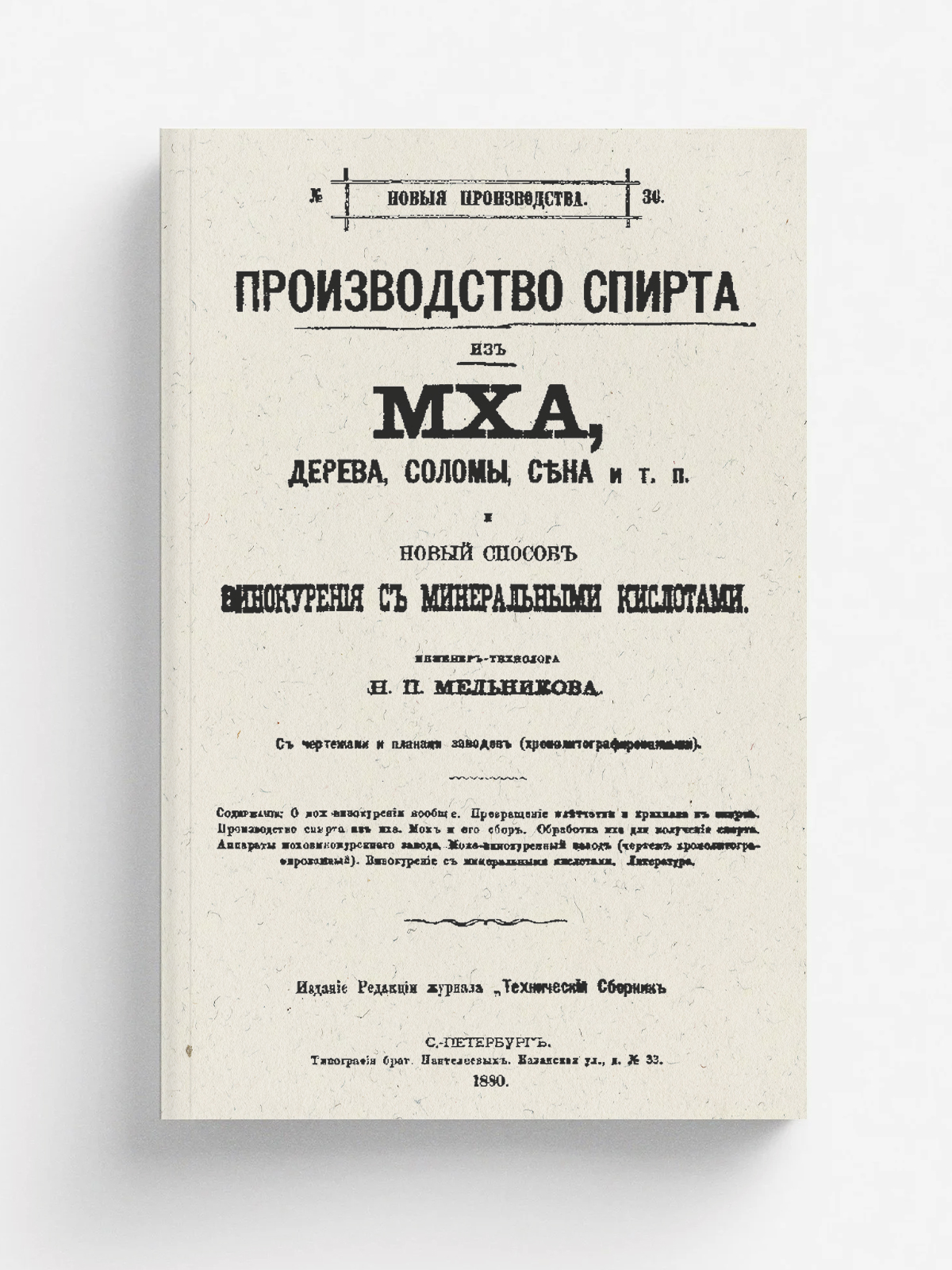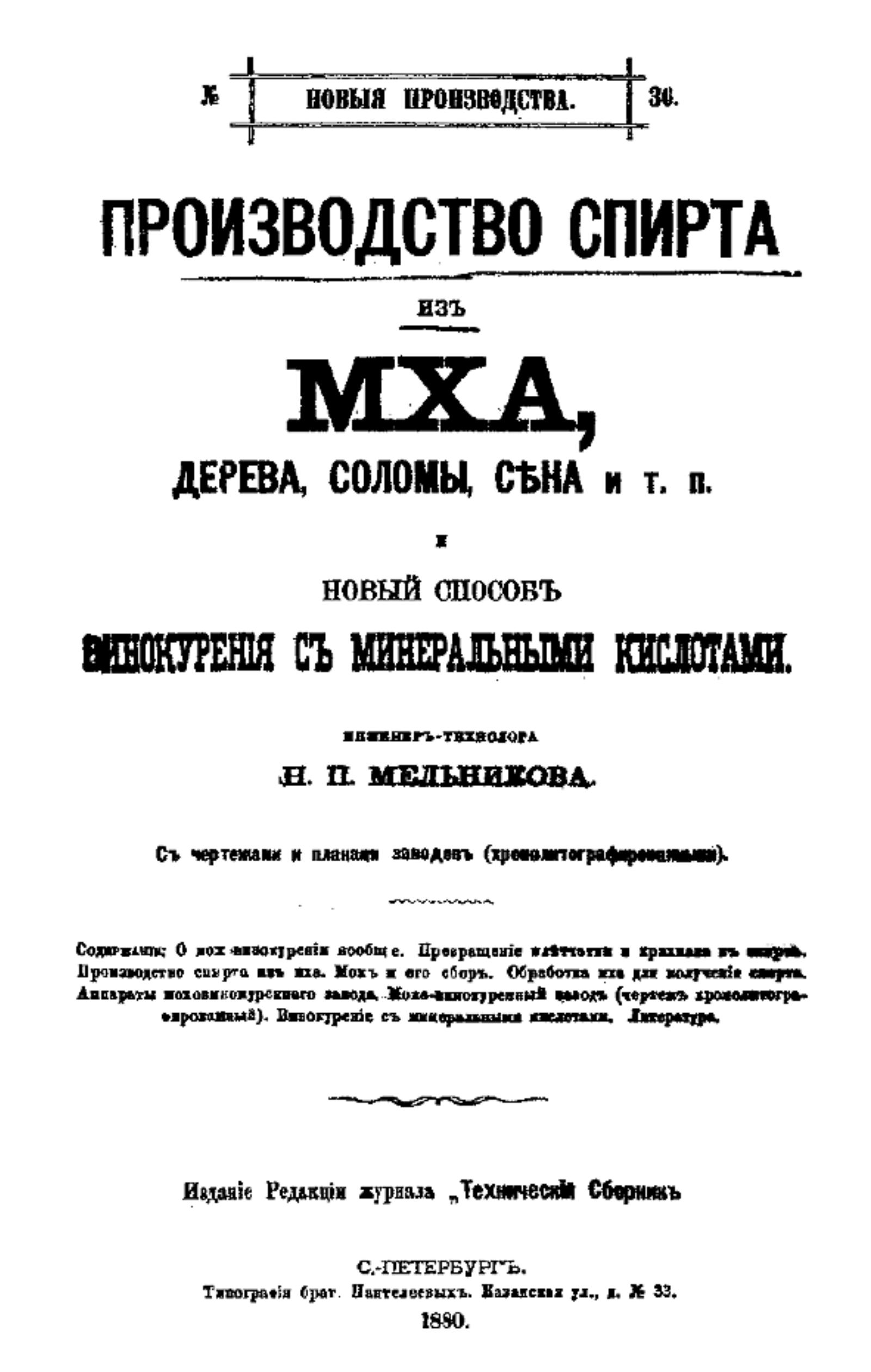Мельников, Николай Петрович (1848–). Производство спирта из мха, дерева, соломы, сена и т. п. и новый способ винокурения с минеральными кислотами / [Соч.] Инж.-технол. Н. П. Мельникова. — Санкт-Петербург : ред. журн. «Техн. сборник», 1880. — 48 с., 2 л. черт. : ил.; 26. — (Новые производства).