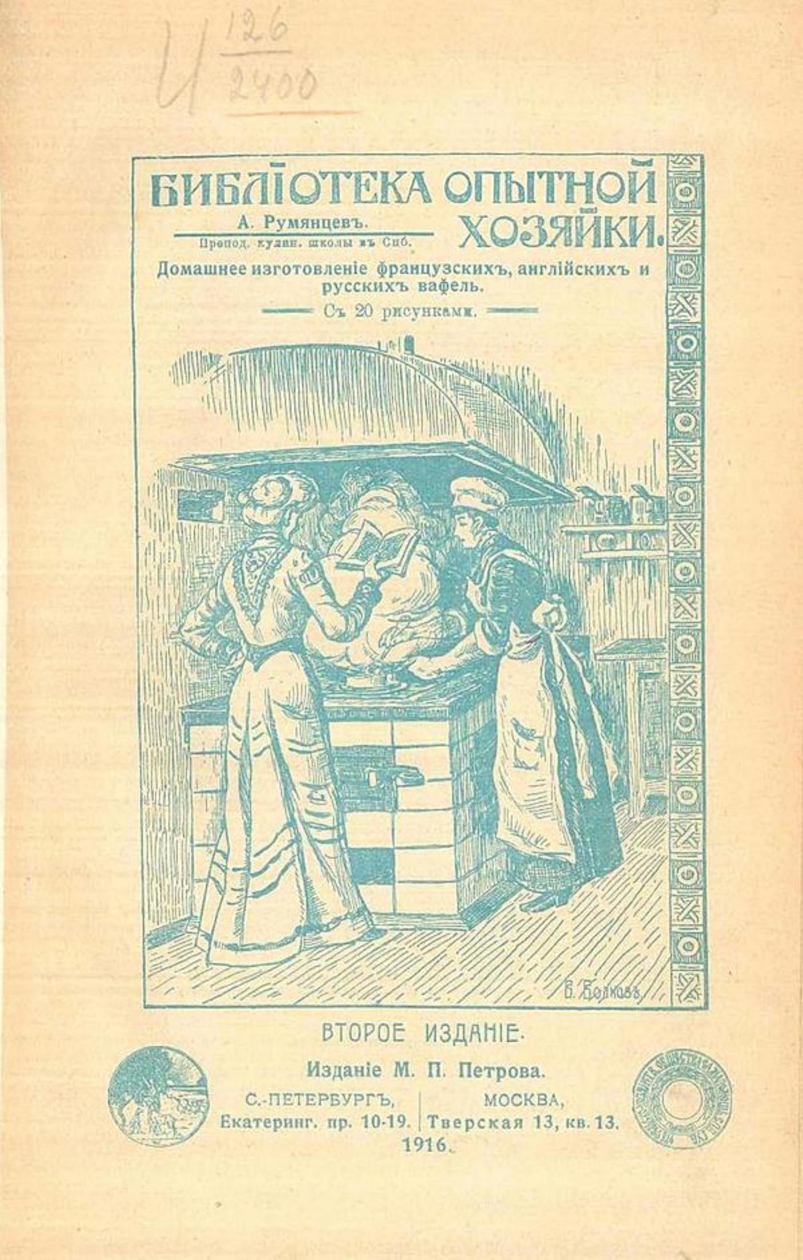 Румянцев, А. Производство вафель. Как изготовлять домашним способом английские, русские и французские вафли / А. Румянцев; Под ред. Ю. П[етрова]. — 2-е изд. — Санкт-Петербург ; Москва : М. П. Петров, 1916 (Санкт-Петербург). — 32 с. : ил.; 23. — (Библиотека «Опыт хозяйки»).