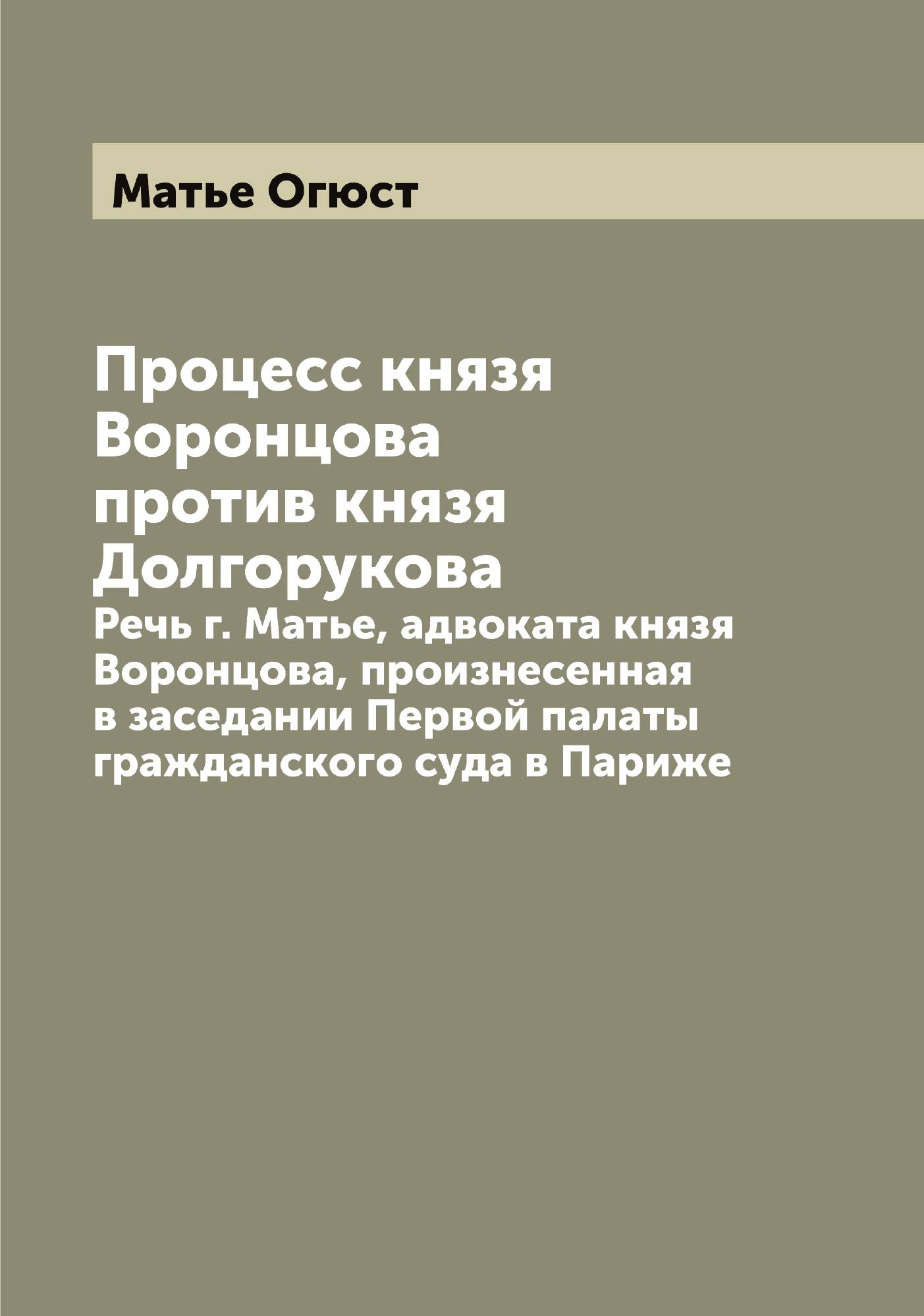 Печатная книга «Процесс князя Воронцова против князя Долгорукова, Речь г. Матье, адвоката князя Воронцова, произнесенная в заседании Первой палаты гражданского суда в Париже» в мягкой обложке, язык - русский. В книге 101 страниц, она напечатана на белой офсетной бумаге плотностью 80 г/м². Формат издания — 165x235 мм. Все книги аккуратно упаковываем в прочный трёхслойный непрозрачный картонный конверт.