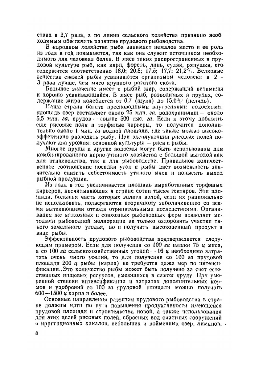 Приводятся сведения об устройстве рыбоводных прудов производственных процессах в тепловодном карповом и холодноводном форелевом прудовых хозяйствах, заводском методе инкубации икры, разведении растительноядных рыб, ноликультуре, интенсивных формах карпового и форелевого прудового хозяйства комоипировапиых видах прудового хозяйства (рисо-рыбное карпо-утиное), рыбоводству на торфяные карьерах, ирригационных системах и водоемах комплексного использования.