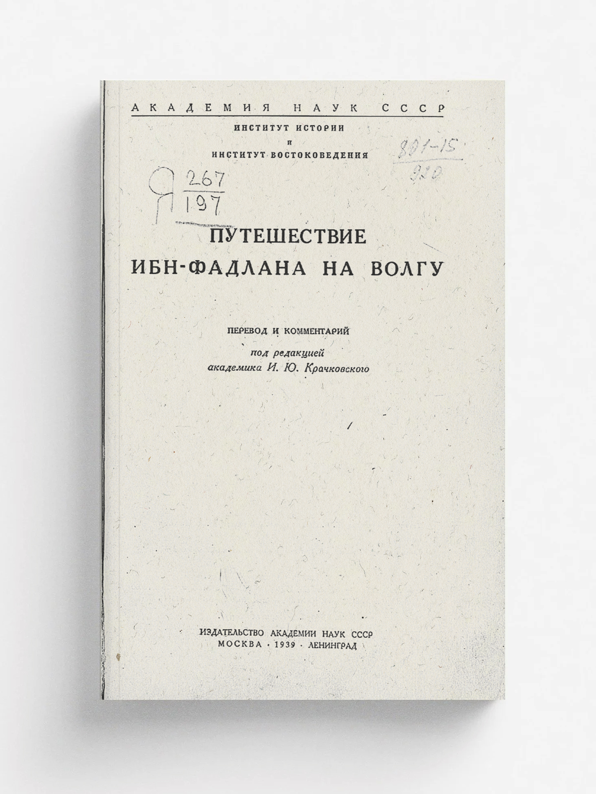 Ибн Фадлан, Ахмед (X в.). Путешествие Ибн-Фадлана на Волгу [Текст] / Пер. и комментарий под ред. И. Ю. Крачковского; Акад. наук СССР, Ин-т истории и Ин-т востоковедения. — Москва ; Ленинград : Изд-во Акад. наук СССР, 1939 (Ленинград). — 194 с., 34 с. фотографии рукописи : фотографии рукописи; 27 см.