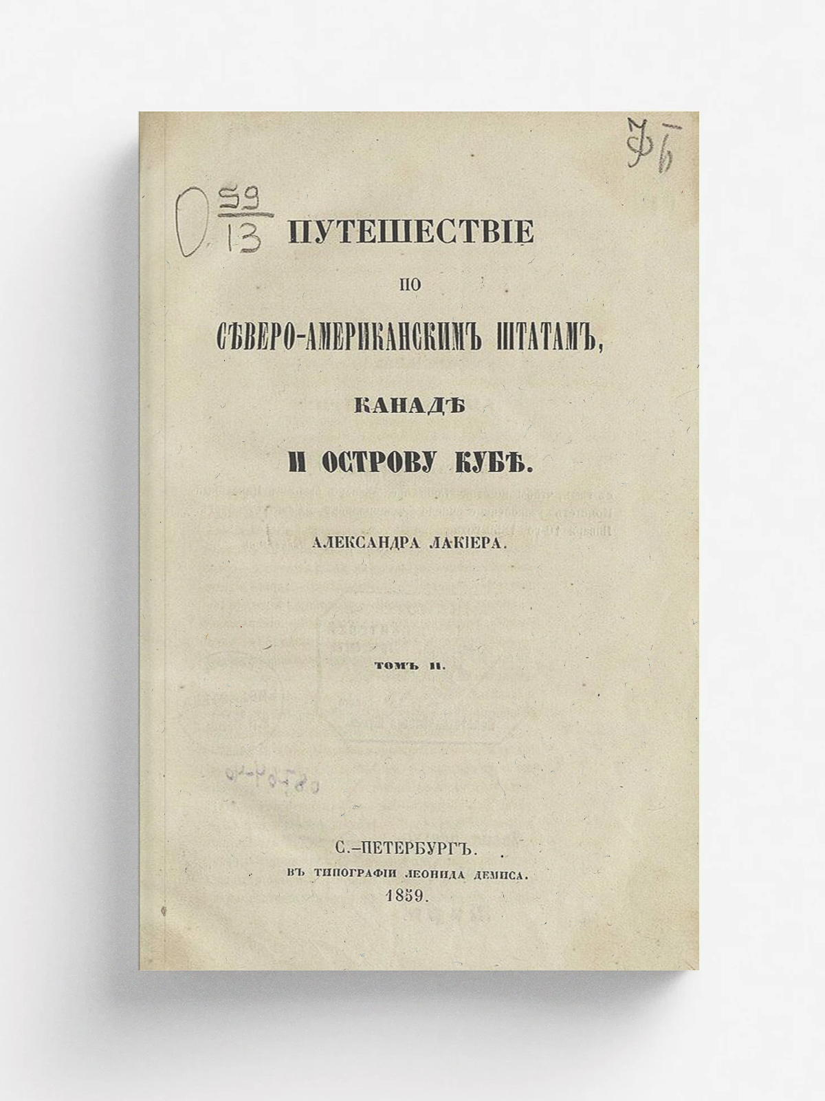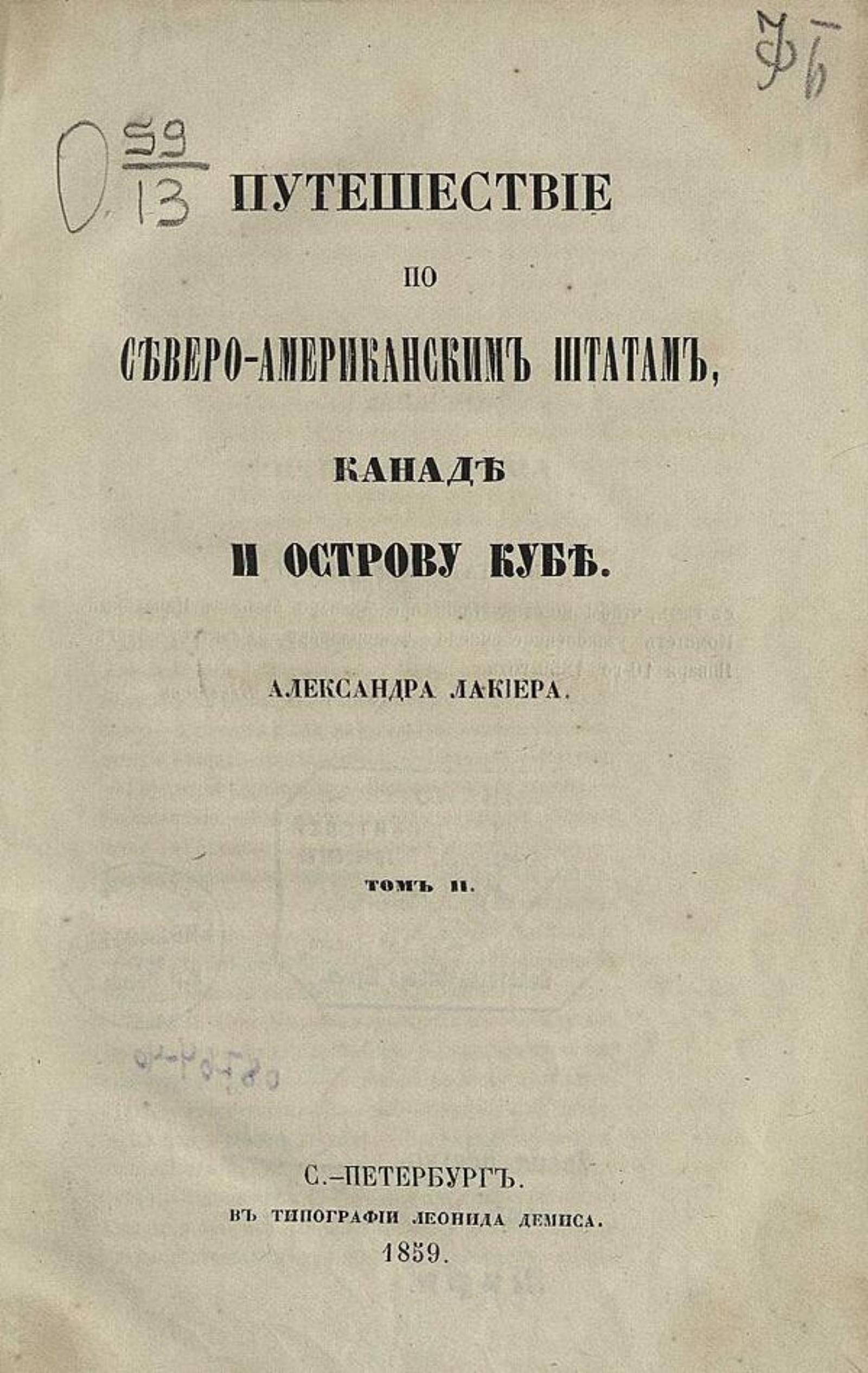 Лакиер, Александр Борисович (1824–1870). Путешествие по Северо-Американским Штатам, Канаде и острову Кубе / [Соч.] Александра Лакиера. Т. 1–2. — Санкт-Петербург : тип. К. Вульфа, 1859. — 2 т.; 21. Т. 2. — Санкт-Петербург : тип. Л. Демиса, 1859. — [4], IV, 400, VII с.