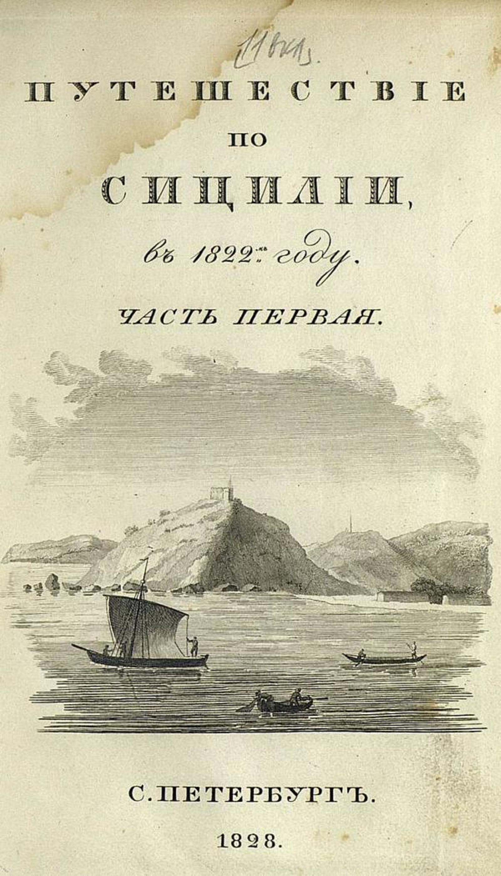 Норов, Авраам Сергеевич (1795–1869). Путешествие по Сицилии в 1822 году / [Соч.] А. Норова. — Санкт-Петербург : Тип. А. Смирдина, 1828. — 23 см. Ч. 1. — 1828. — [2], VI, [8], 245 с., 1 л. фронт. (ил.), 4 л. ил., карт.
