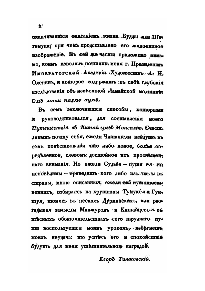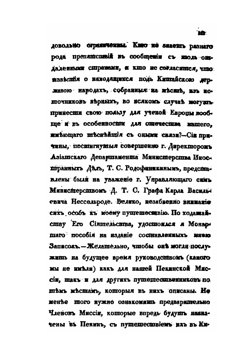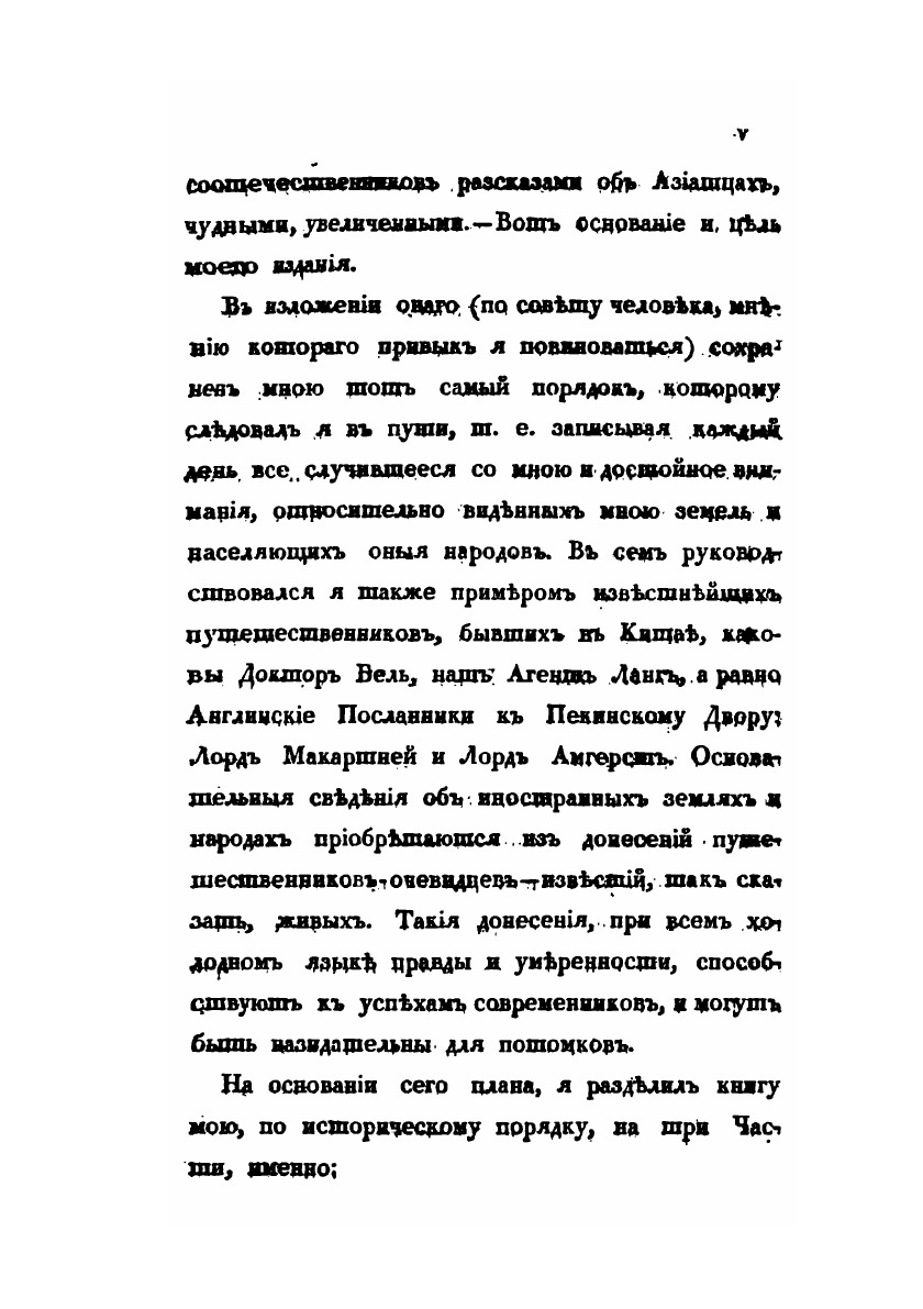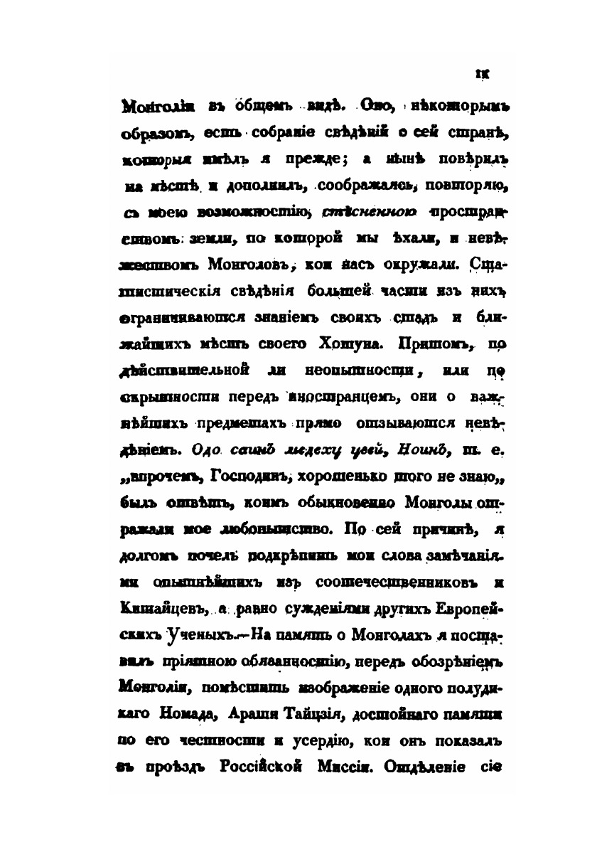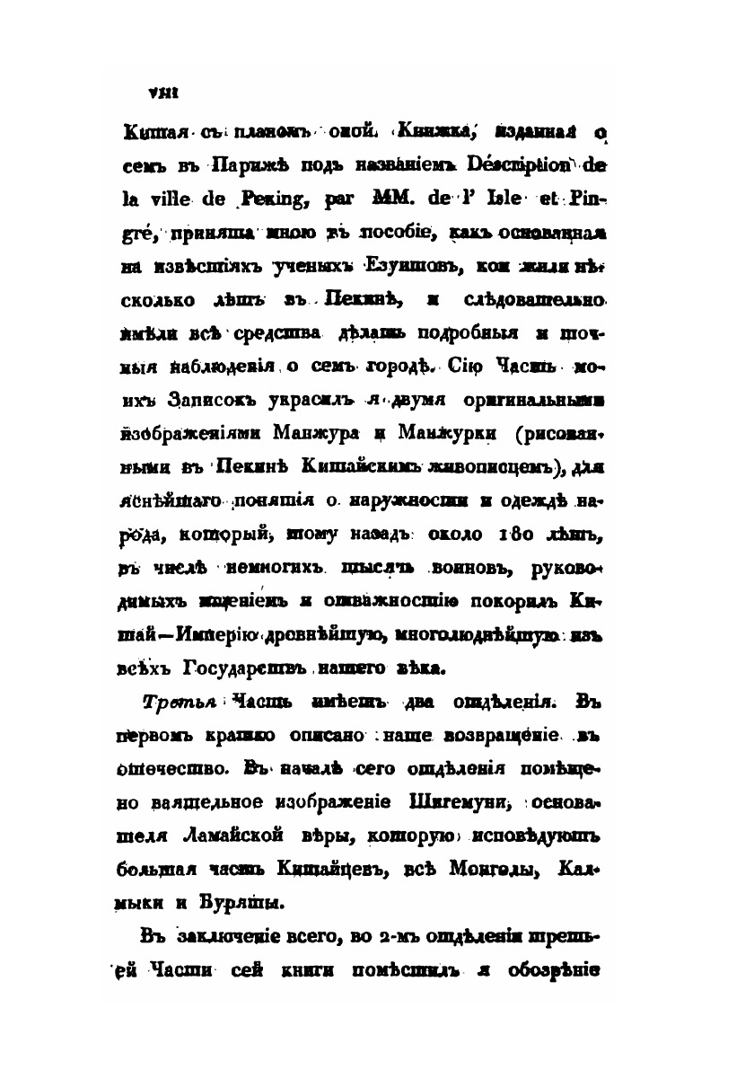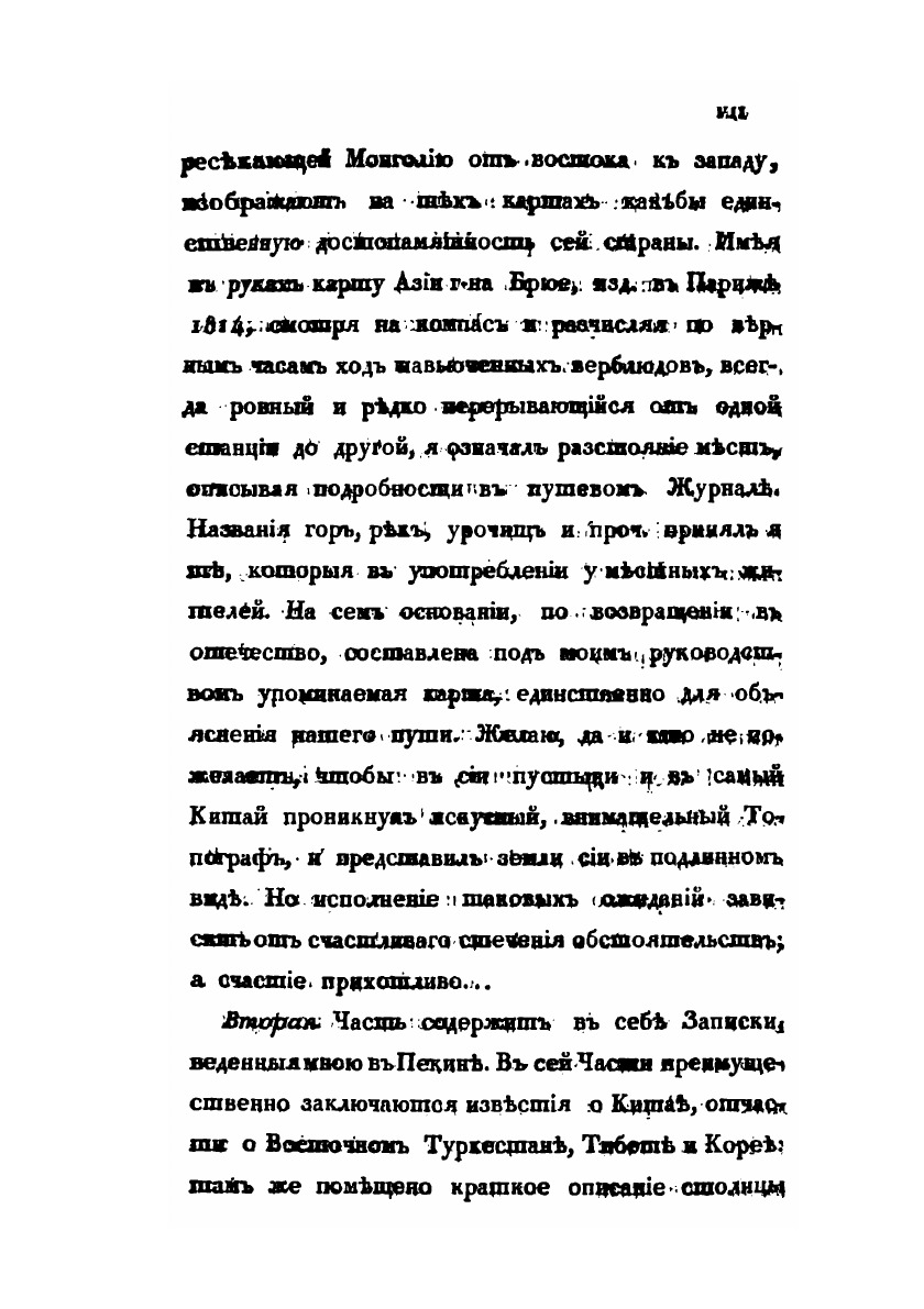 Первая часть отчёта о поездке в Китай, описывающая путь до Пекина, быт и нравы кочевых монголов.1.Основание и цель пребывания Российской Миссии в Пекине. Приготовления в путь.2.Отправление Миссии из Отечества. Переезд до города Урги в Монголии.3.Пребывание в Урге.4.Продолжение пути до южных пределов Халхаского Княжества.5.Переезд миссии по аймаку Монголов Сунитов. Кочевья Восточных Сунитов.6.Путешествие по кочевьям войска Цахарскогодо крепости Халгань, лежащей в Великой Стене Китайской.7.Прибытие в Халган. Пребывание в оном.8.Переезд миссии от Халгана до Пекина.