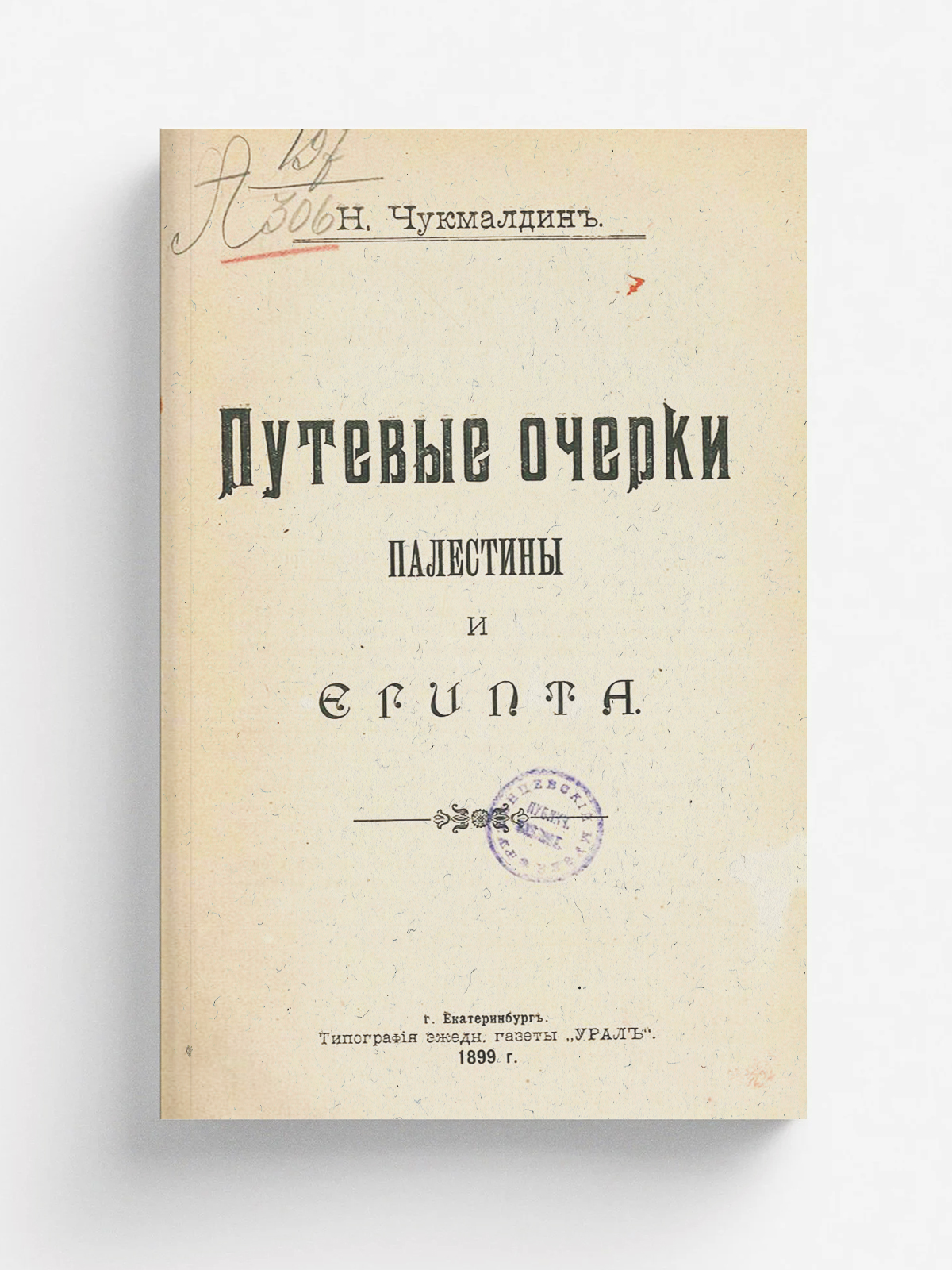 Чукмалдин, Николай Мартемьянович (1836–1901). Путевые очерки Палестины и Египта / Н. Чукмальдин. — Екатеринбург : тип. ежедн. газ. «Урал», 1899. — 79 с.; 26.
