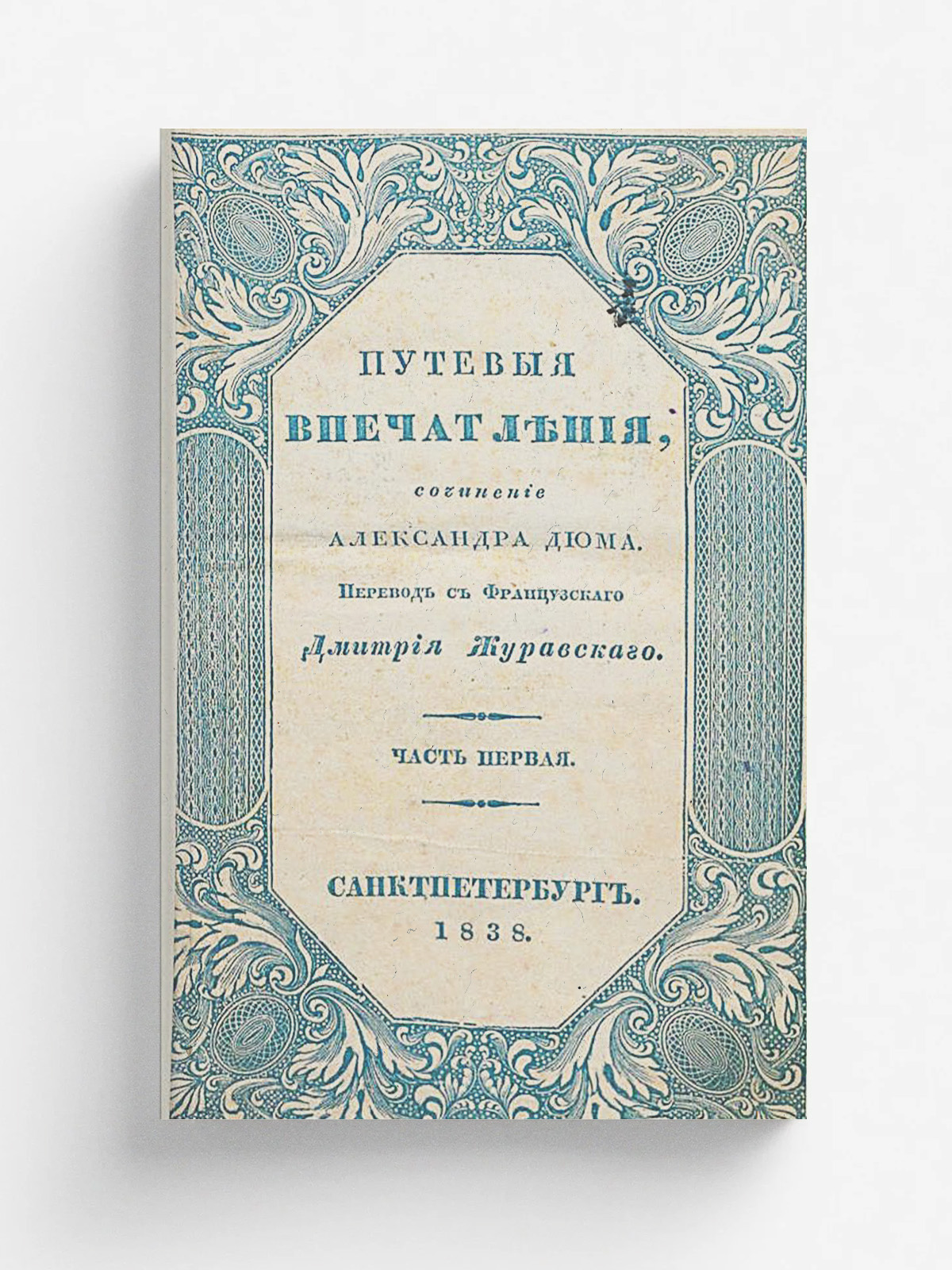Дюма, Александр (отец; 1802–1870). Путевые впечатления [Текст] / сочинение Александра Дюма ; перевод с французского Дмитрия Журавского. — Санкт-Петербург : в типографии Х. Гинце, 1838. — 17 см. Ч. 1 [Текст]. — 1838. — [4], 368 с.