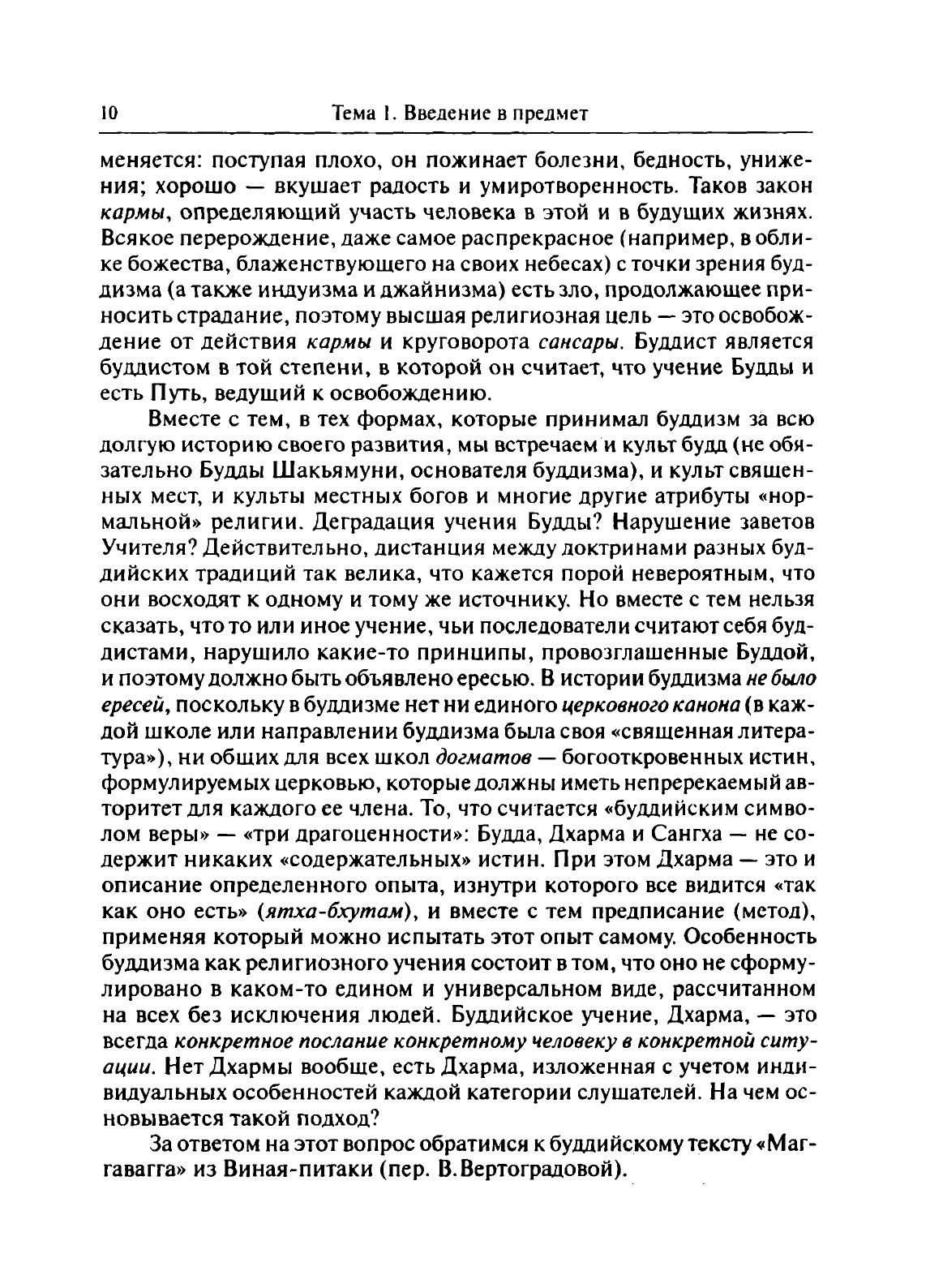 Учебное пособие «Ранний буддизм: религия и философия» состоит из Предисловия, 13 глав, Словаря основных терминов, и посвящено основным вопросам изучения раннего буддизма. Среди них: религиозно-философские представления в эпоху жизни Будды (5–4 вв.) до н.э.), понимание Буддой природы человека и его участи в мироздании, роли сознания в определении индивидуальной судьбы и причин, вовлекающие людей в круговорот перерождений, а также возможности освобождения от него. Кратко рассматривается эволюция учения Будды в более поздних направлениях буддизма (хинаяне, махаяне и ваджраяне). В каждой главе подробно разбираются тексты из «Сутта питаки» («Корзины бесед») второй части «Типитаки» — буддийского палийского канона школы тхеравада (многие из них переведены на русский язык впервые). В конце каждой главы – список рекомендованной литеруры и вопросы для самопроверки. Для студентов и преподавателей гуманитарных специальностей (история религии, история философии, культурология) и для всех, интересующихся буддийской культурой.