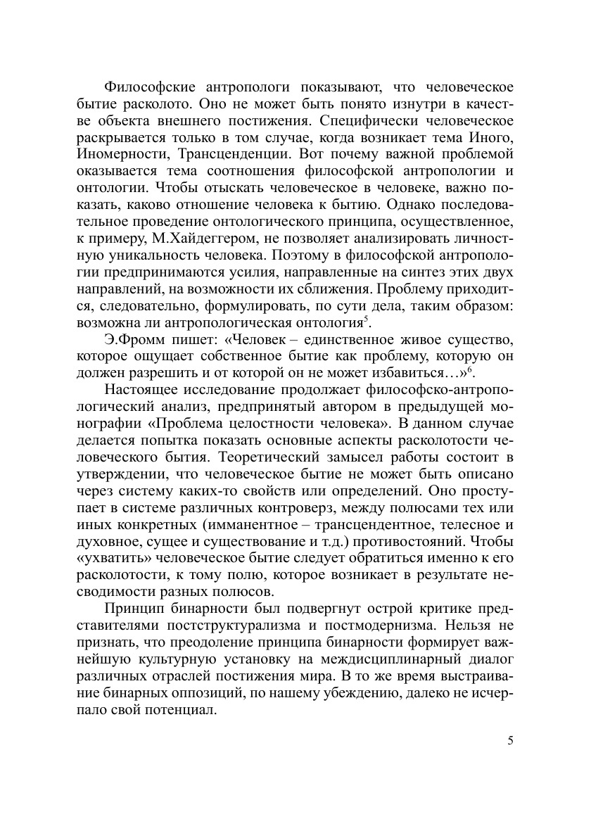 Данная монография представляет собой развитие ряда идей, которые содержатся в работе автора «Проблема целостности человека» (М., 2004). Раскрывая смысл современного толкования человеческого бытия, автор предлагает свое прочтение данной проблемы. Расколотость человеческого бытия показана через бинарные оппозиции бытия и небытия, целостного и раздробленного, телесного и духовного, имманентного и трансцендентного, индивидуального и социального, идентичного и безликого, творческого и разрушительного. Особое внимание в монографии уделено анализу современных философско-антропологических концепций. В книге развивается ряд полемических сюжетов, обращенных к проблеме «смерти человека», «целостности человека», «распаду идентичности» и т. д.