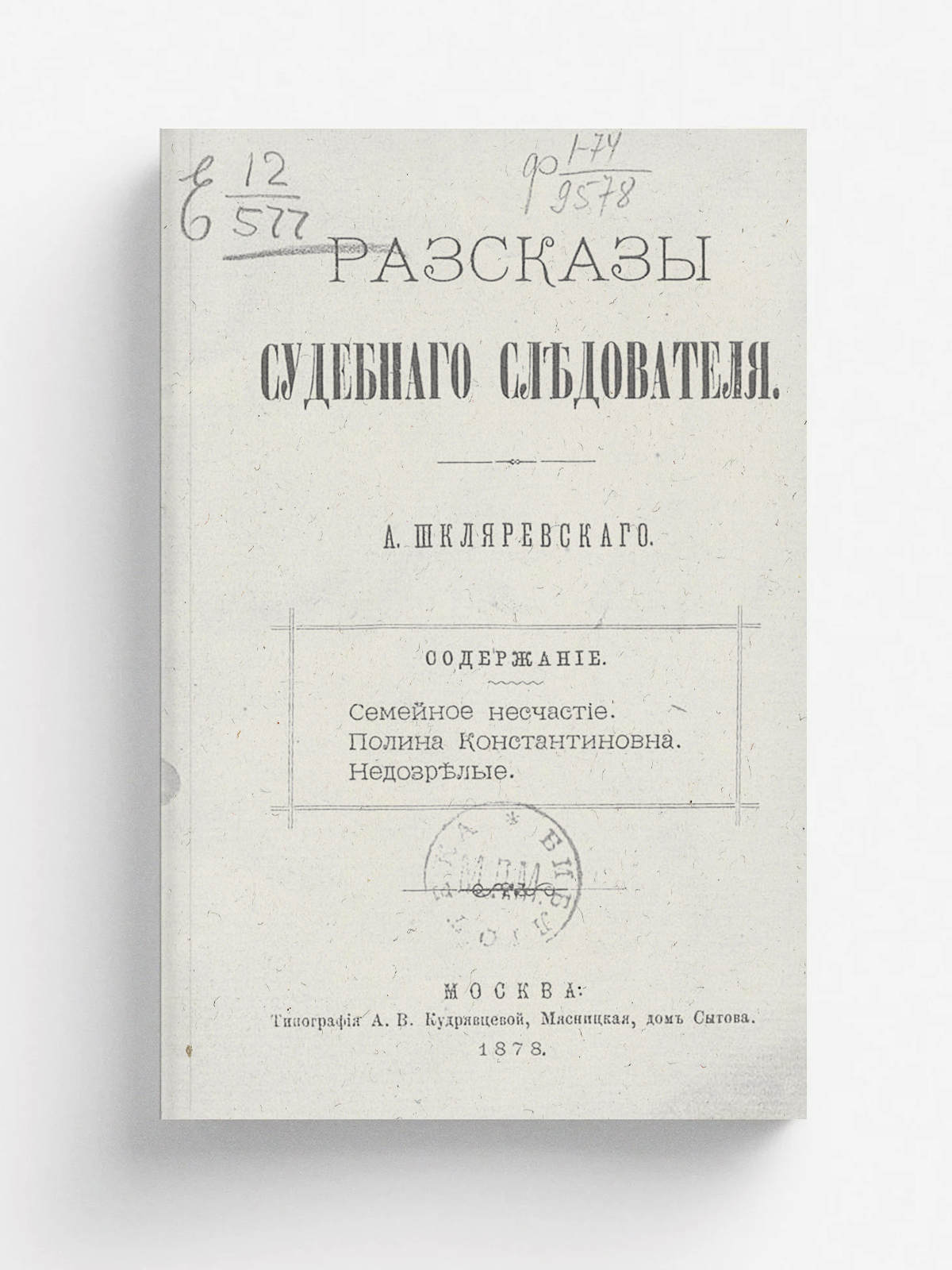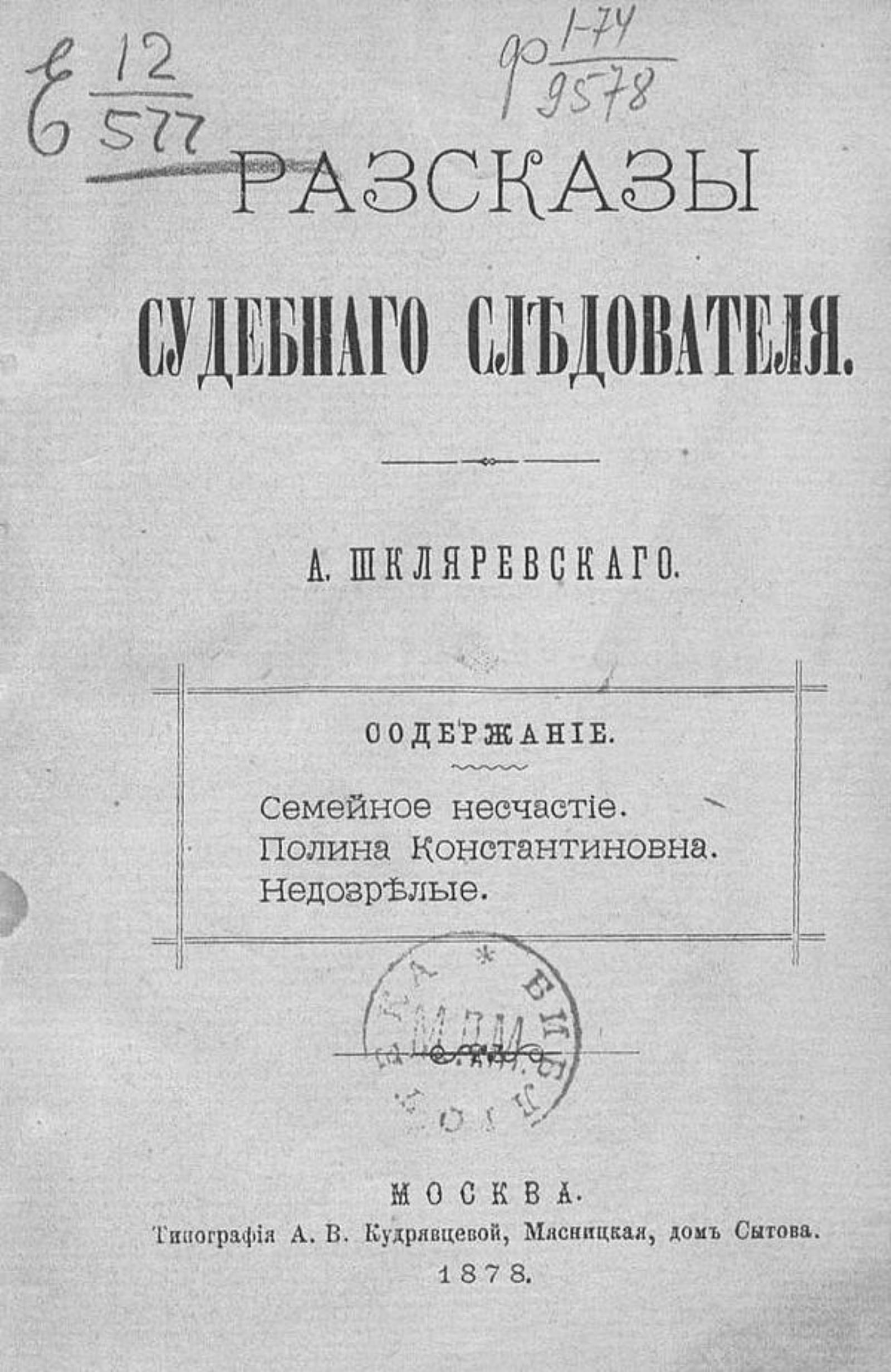 Шкляревский, Александр Андреевич (1837–1883). Рассказы судебного следователя / [Соч.] А. Шкляревского. — Москва : тип. А. В. Кудрявцевой, 1878. — [2], 170 с.; 18.