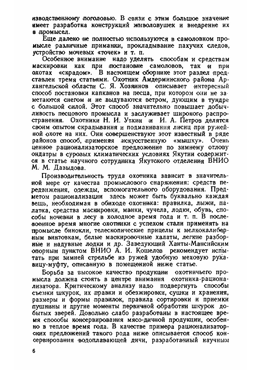 Техника охотничьего промысла — результат многовекового опыта и творческого труда передовых охотников. Основными орудиям и добычи промысловых зверей и птиц, на ряду с современным технически совершенным ружьем, являются такие несложные по своему устройству самоловы как капкан, плашки, черкан, петли и др. Некоторые из них настолько просты, что их можно изготовить на месте промысла из подручных материалов. Однако - правильное использование самоловов — дело не легкое. Оно требует хорошего знания местности и повадок зверя. Недостаточно иметь хороший самолов, надо правильно выбрать место для постановки, тщательно замаскировать его и привлечь к нему зверя приманкой или пахучим следом.