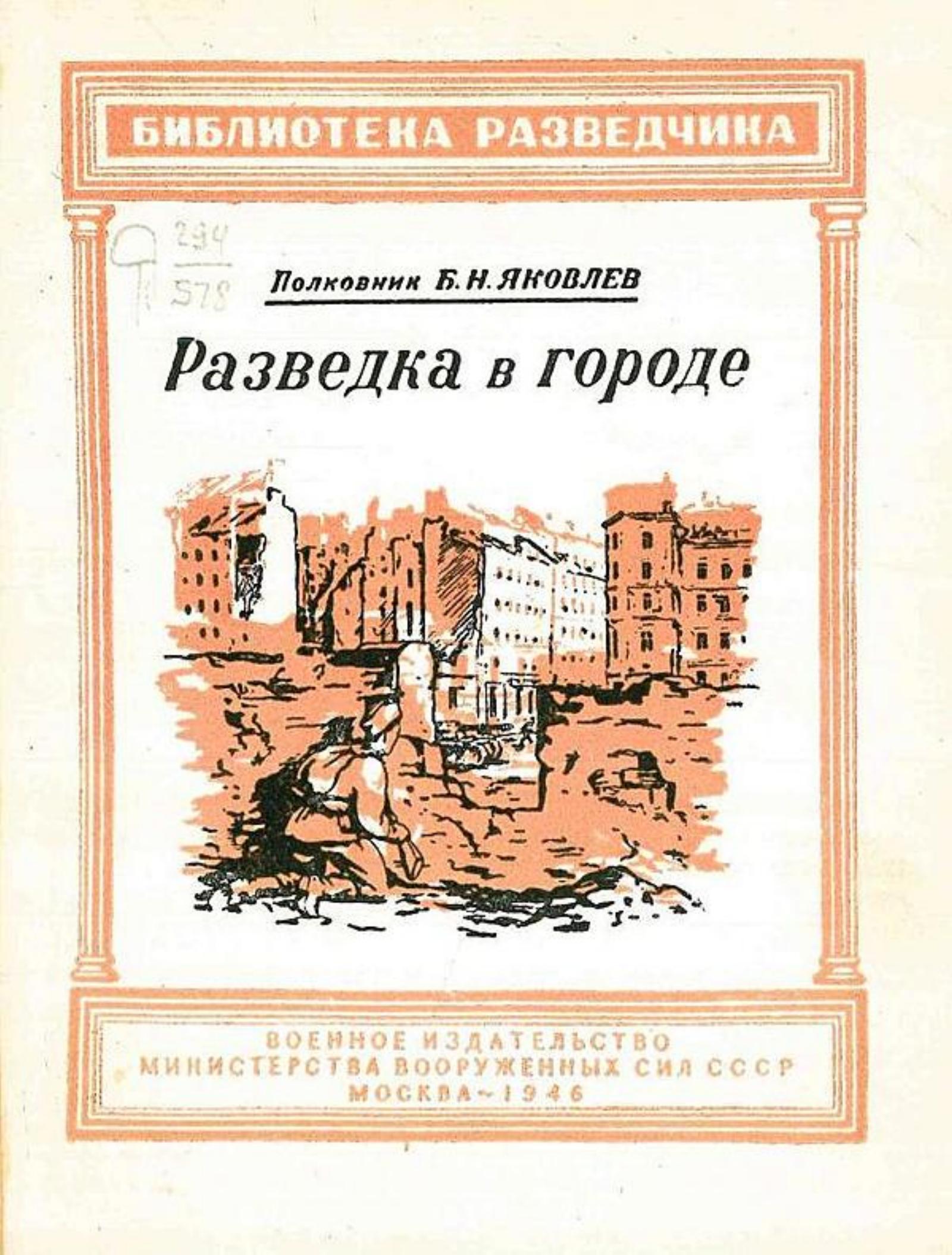 Яковлев, Борис Николаевич. Разведка в городе / Полк. Б. Н. Яковлев ; Под общ. ред. ген.-майора С. И. Сурина. — Москва : Воен. изд-во, 1946 (тип. им. Тимошенко). — 123 с., 2 л. схем. : схем.; 16 см. — (Б-ка разведчика).
