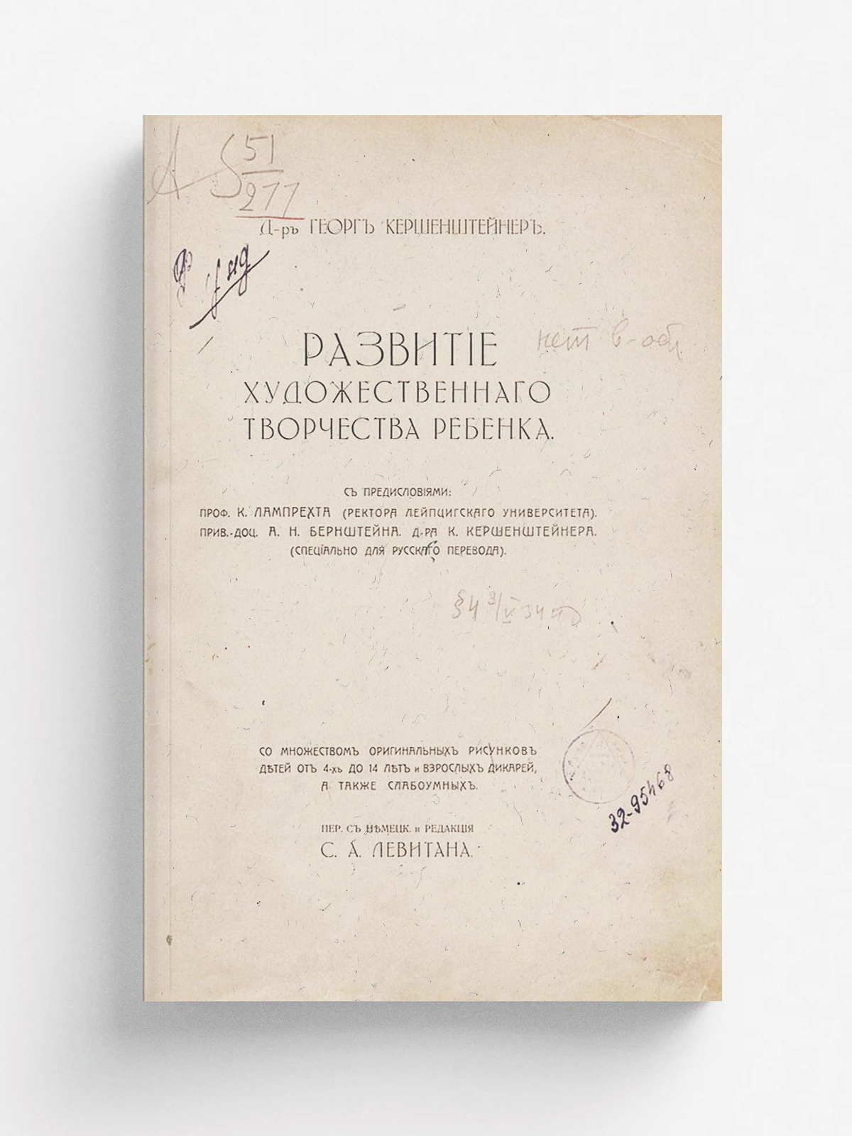 Кершенштейнер, Георг (1854–1932). Развитие художественного творчества ребенка : Со множеством ориг. рис. детей от 4 до 14 лет и взрослых дикарей, а также слабоумных / С предисл.: проф. К. Лампрехта (ректора Лейпциг. ун-та), прив.-доц. А. Н. Бернштейна, д-ра К. Кершенштейнера (специально для рус. пер.); Пер. с нем. и ред. С. А. Левитана. [Т. 1]. — Москва : тип. т-ва И. Д. Сытина, 1914. — 29.