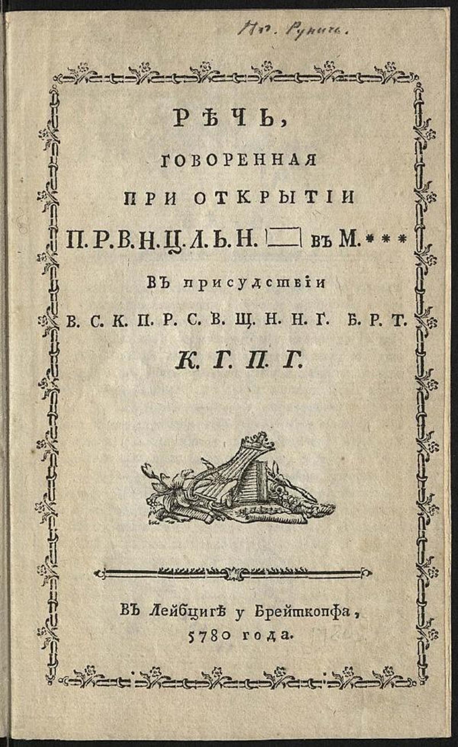 [Москва] : [Унив. тип., у Н. Новикова], [1780]. — 10 с.; 8. Полное загл. : Речь, говоренная при открытии Провинциальной ложи в Москве в присутствии высокопреосвещенного брата князя Гаврилы Петровича Гагарина. Слово «ложа» на тит. л. обозначено знаком прямоугольника. На тит. л. вымышленные вых. дан. : Лейбциг, у Брейткопфа, 5780. Предполагаемый авт. речи Иван Росляков, ритор масонской Провинциальной ложи.