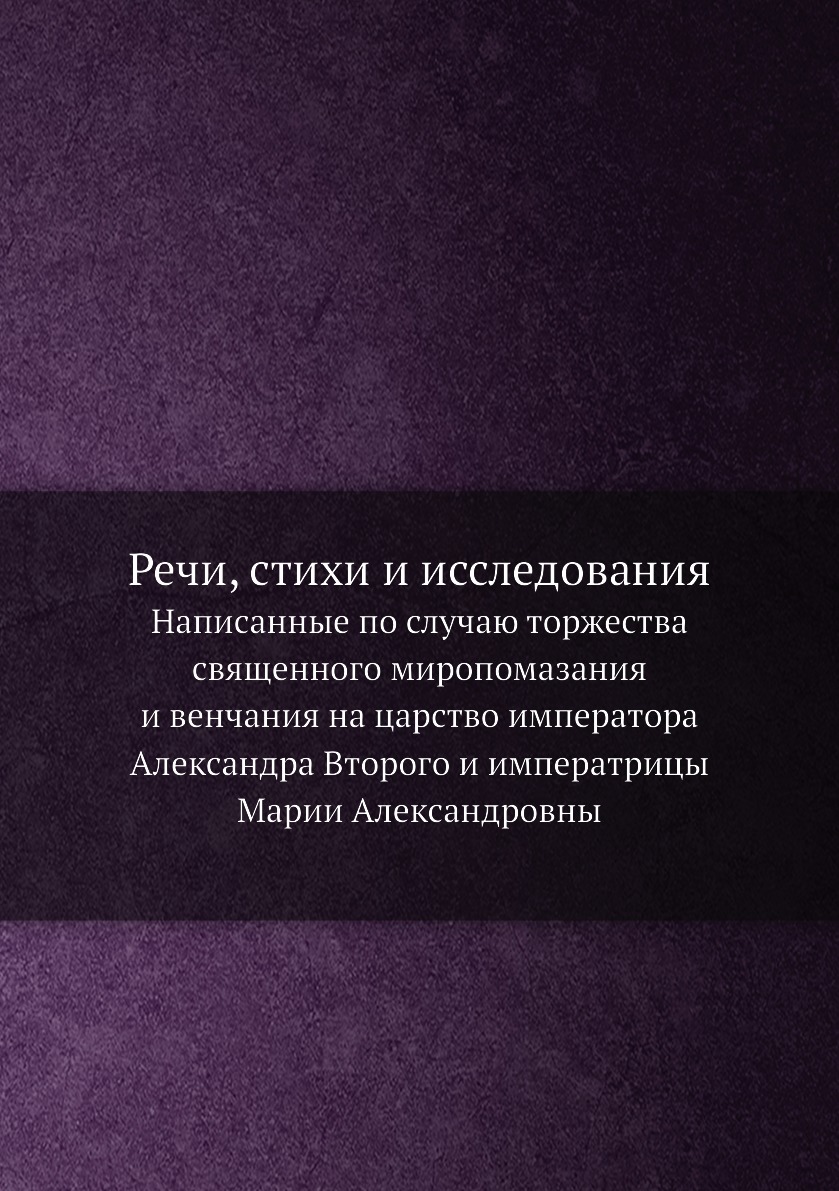 Печатная книга «Речи, стихи и исследования, Написанные по случаю торжества священного миропомазания и венчания на царство императора Александра Второго и императрицы Марии Александровны» в мягкой обложке, язык - русский. В книге 200 страниц, она напечатана на белой офсетной бумаге плотностью 80 г/м². Формат издания — 148x210 мм. Все книги аккуратно упаковываем в прочный трёхслойный непрозрачный картонный конверт.