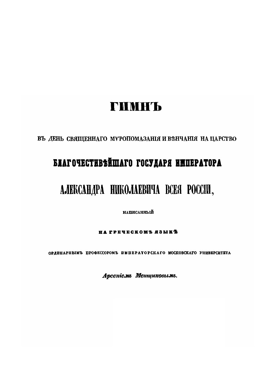 Речи, стихи и исследования, написанные по случаю торжества священного миропомазания и венчания на царство государя императора Александра Второго, самодержца Всероссийского и августейшей его супруги государыни императрицы Марии Александровны, ординарными профессорами Императорского Московского Университета, для торжественного собрания 31-го августа 1836 года.