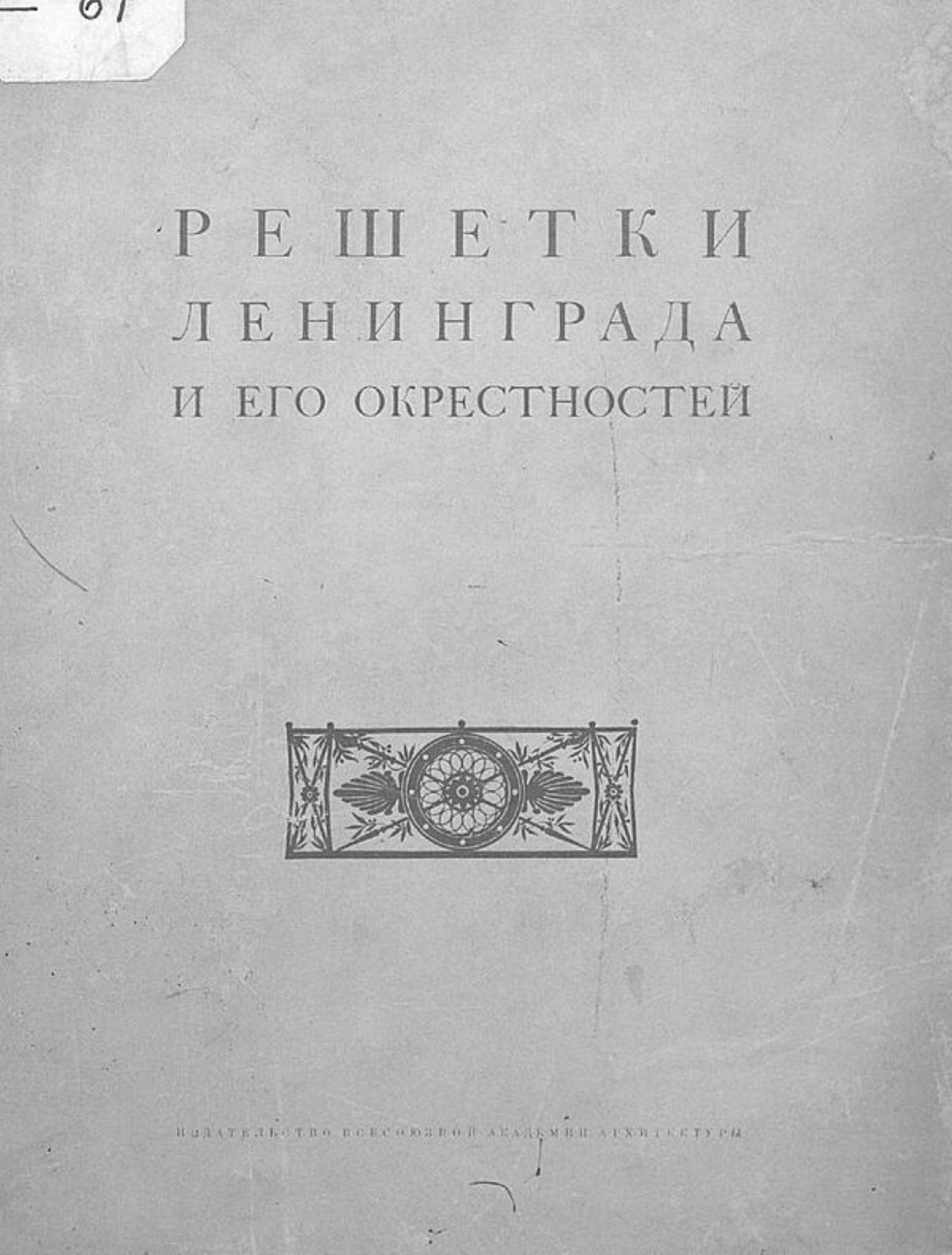 Гермонт, Г. Решетки Ленинграда и его окрестностей: [Альбом] / Вступ. очерк В. Курбатова. — Москва: Изд-во Всес. акад. архитектуры, 1938 (Образцовая тип.). — 30 с. текста, 80 с. ил.; 30 см.