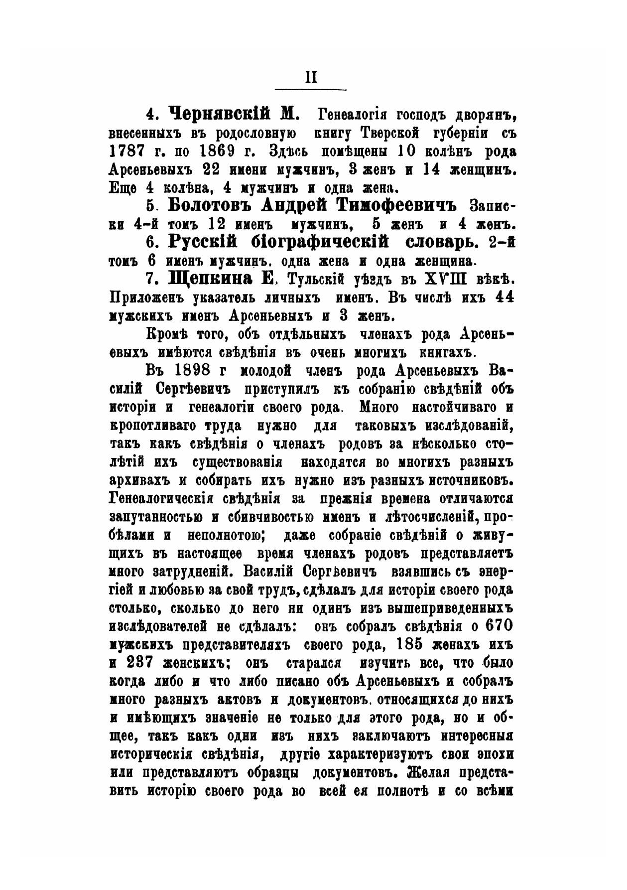 Род дворян Арсеньевых славен как древностью происхождения, насчитывающей более пяти веков, так и верной службой Родине и царю своих многочисленных представителей.Автором собраны сведения о 670 мужских представителях рода, 185 их жёнах и о 237 женских представительницах рода Арсеньевых.Эти сведения представлены в виде поколенных росписей. У большинства членов рода приведены краткие биографии. В качестве приложения в книге представлен семейный архив Арсеньевых, в нём находятся грамоты, письма, документы и акты относящиеся к роду.Репринтное издание по технологии print-on-demand с оригинала 1903 года