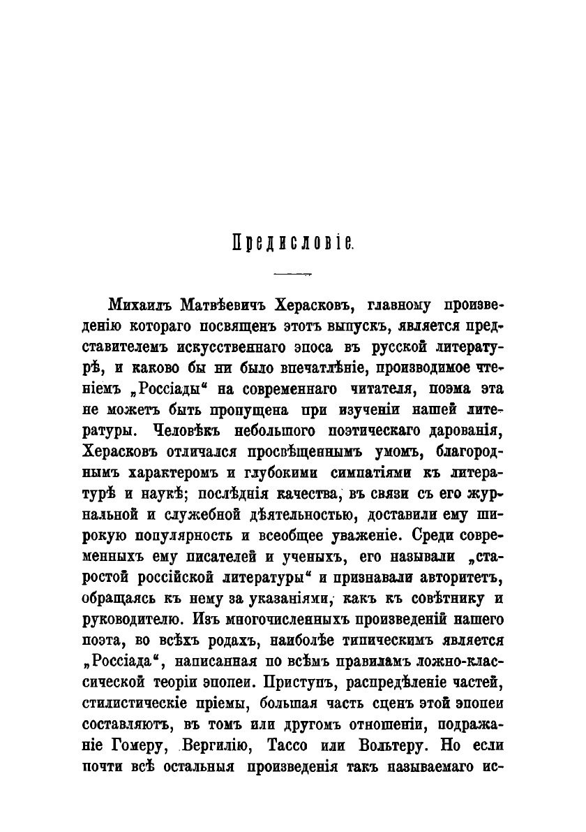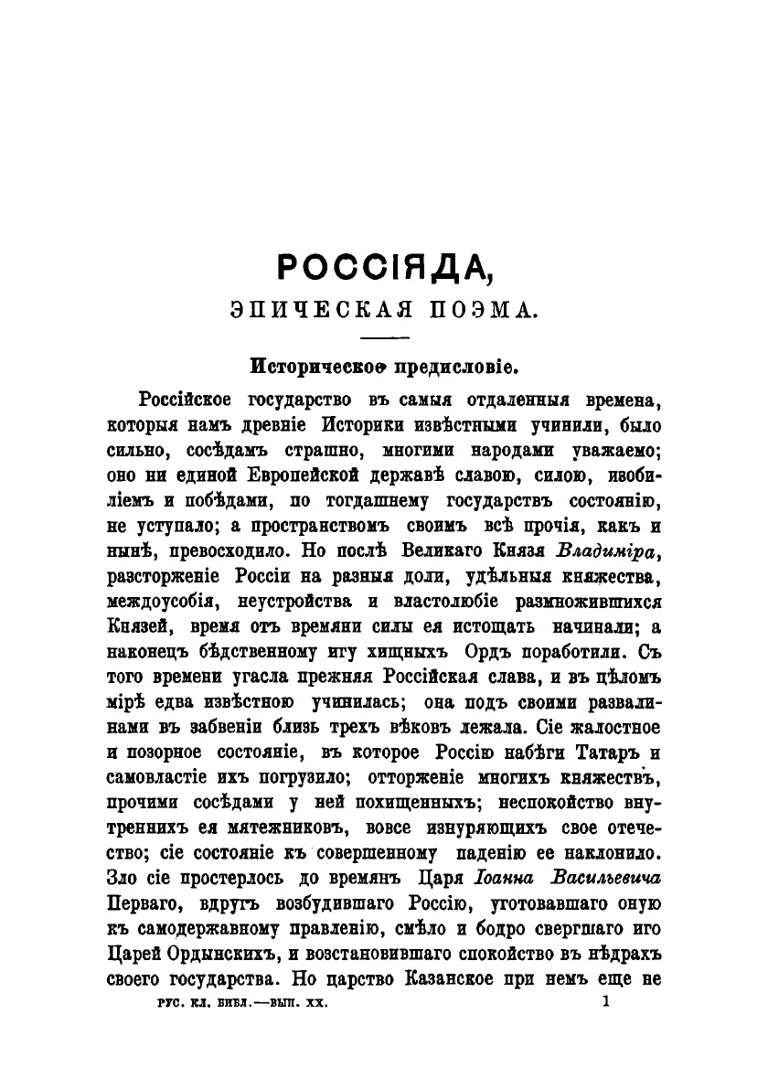 Русская классическая библиотека, издаваемая под редакцией А. Н. Чудинова. Пособие при изучение русской литературы. Выпуск XX-й.Россиада : Поэма в XII-ти песнях. Автор: М. М. Херасков. Полный текст поэмы. Объяснительные статьи. Издание И. Глазунова, 1895