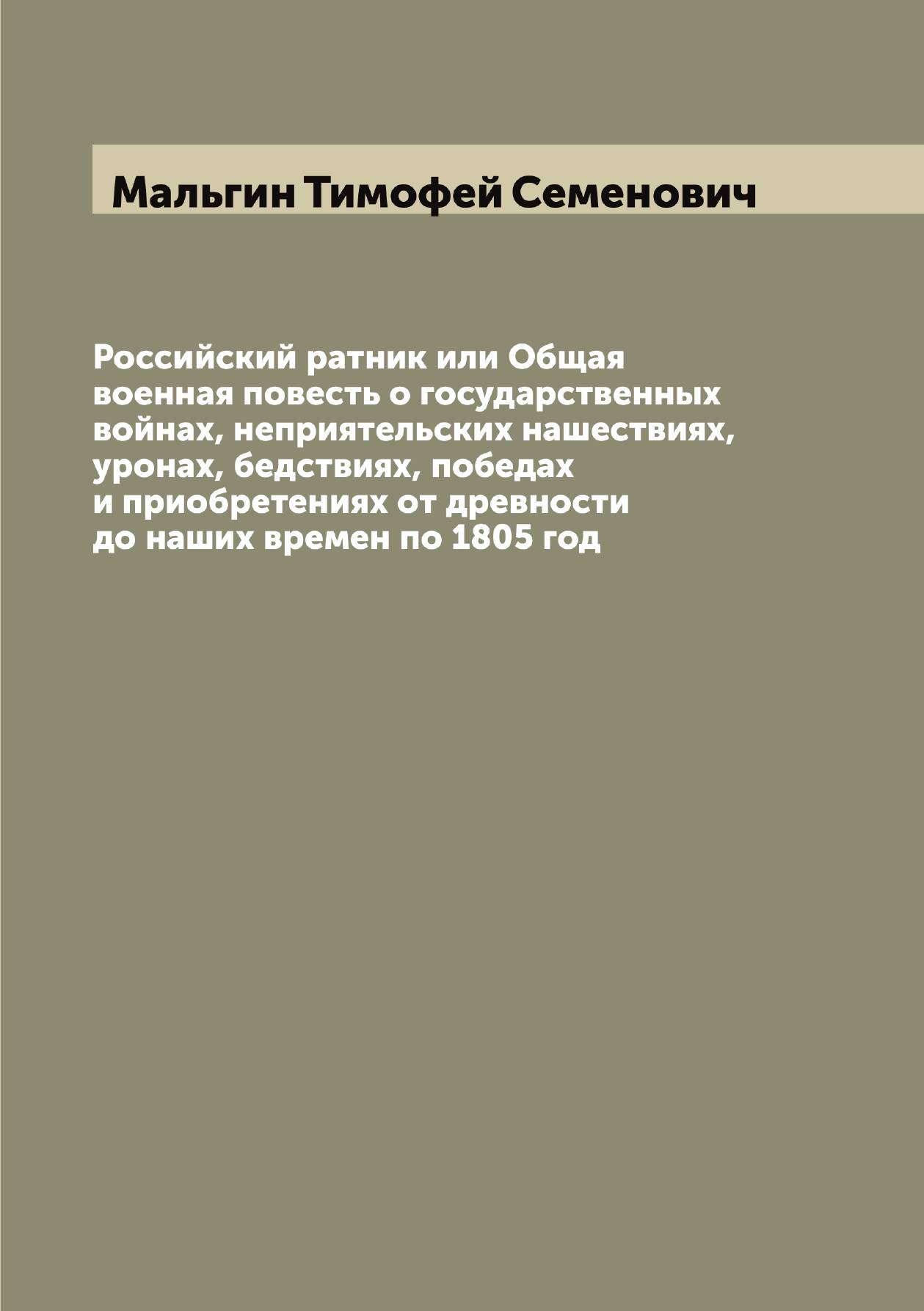 Печатная книга «Российский ратник или Общая военная повесть о государственных войнах, неприятельских нашествиях, уронах, бедствиях, победах и приобретениях от древности до наших времен по 1805 год» в мягкой обложке, язык - русский. В книге 856 страниц, она напечатана на белой офсетной бумаге плотностью 80 г/м². Формат издания — 148x210 мм. Все книги аккуратно упаковываем в прочный трёхслойный непрозрачный картонный конверт.