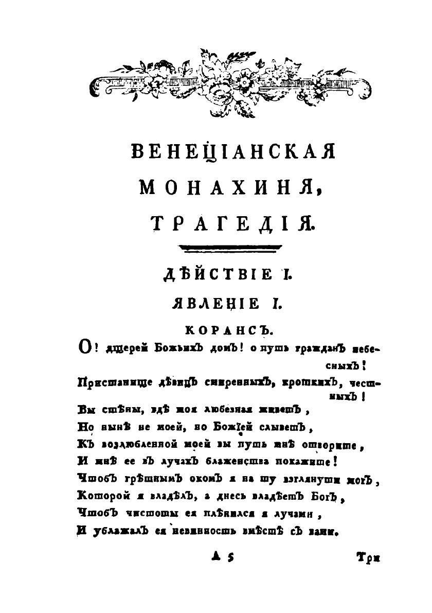 Трагедии: М.Херасков. Венецианская монахиня. - П.Плавильщиков. Дружество. - Прапорщик В.Л. Траян и Лида. - Сакмир.