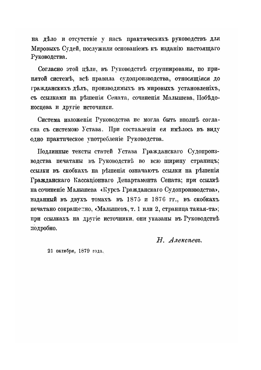 Уставы гражданского судопроизводства. Составил мировой судья Н.Ф. Алексеев. Москва : типография И.И. Смирнова, 1880.