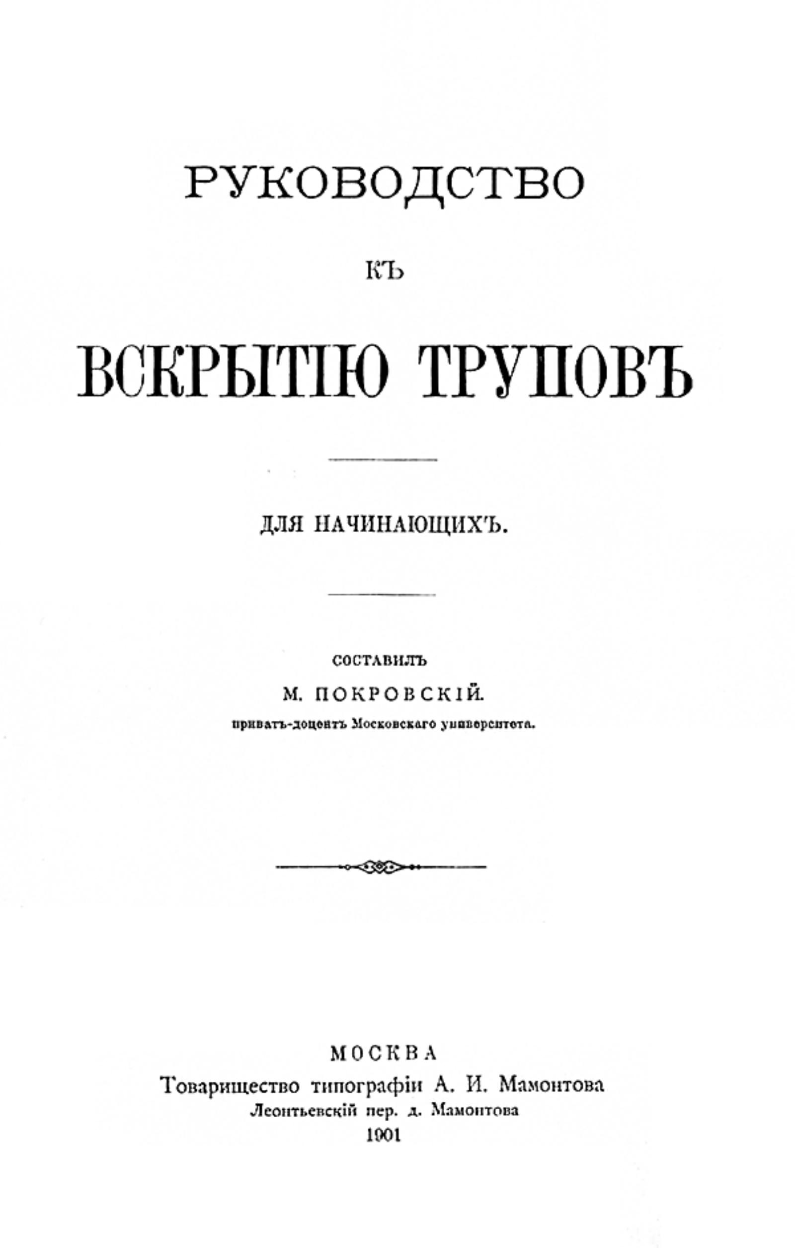 Покровский, Михаил Михайлович (1863–). Руководство к вскрытию трупов : Для начинающих / Сост. М. Покровский, прив.-доц. Моск. ун-та. — Москва : [П. П. Канчаловский], 1901 (т-во тип. А. И. Мамонтова). — 224 с. : ил.; 23.