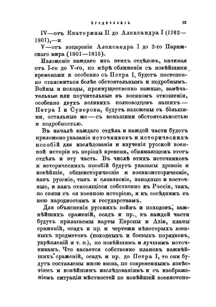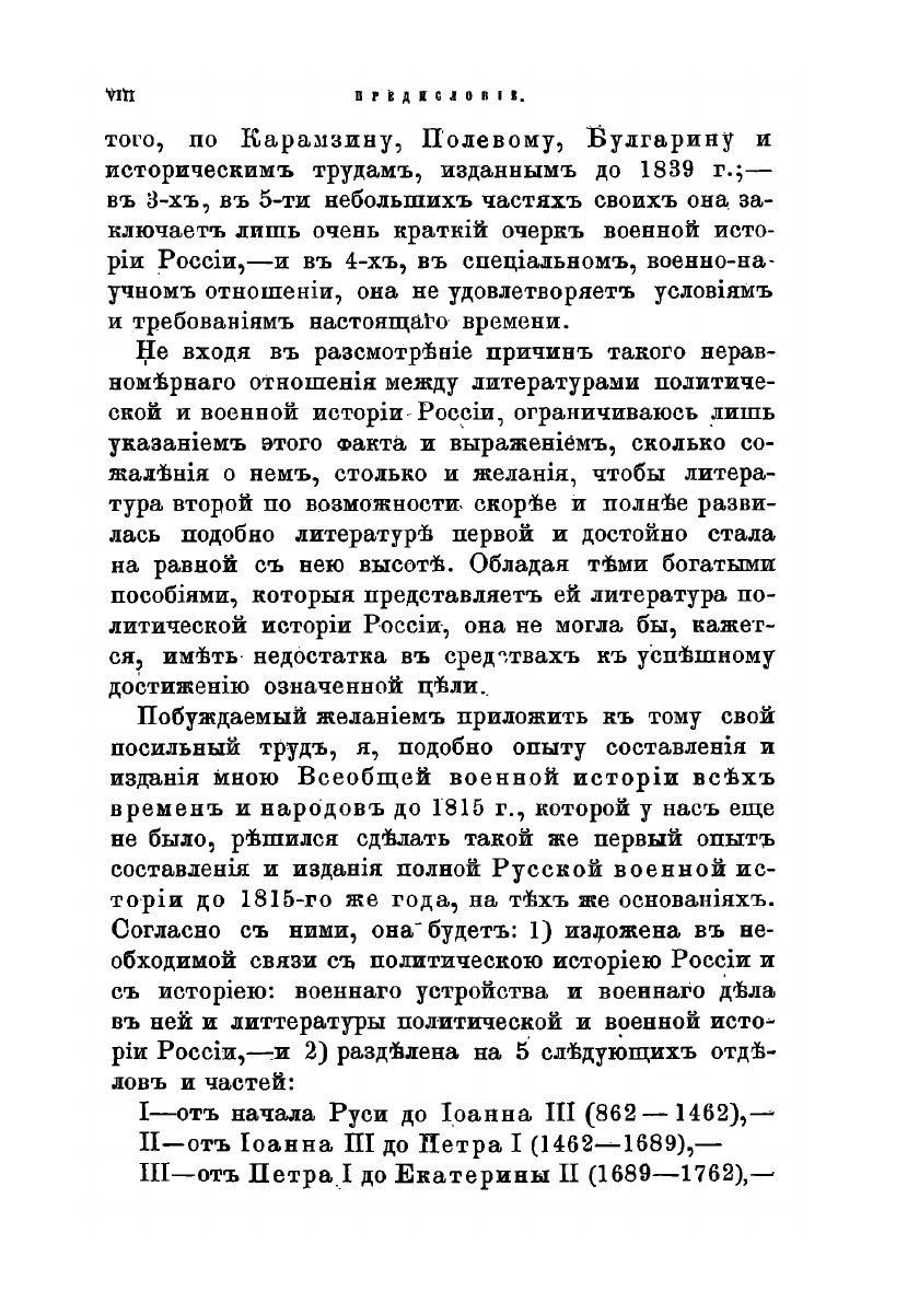 Несмотря на обилие отечественных историков во второй половине 19 века, все они описывали политическую историю страны, касаясь её военной составляющей лишь в общем. Единственным специализированным трудом явилось сочинение Зотова 1839 года, но оно представляло собой краткий очерк военных событий без подробного разбора тактики и стратегии, и составлено было не по оригинальным источникам, а по материалам трудов Карамзина, Полевого, Булгарина и других историографов того периода. Голицын решил восполнить этот пробел по примеру собственной «Всеобщей военной истории», первой обобщающей работе на эту тему. Неразрывно связывая движение военной истории с политическими событиями, он описывает причины и последствия разных отечественных походов и войн, и вместо чисто теоретического научного пособия создает увлекательнейшую познавательную работу по всему русскому военному прошлому. По мысли самого Голицына, именно России принадлежит особое место в мире, как самобытной, обширнейшей и могущественнейшей из славянских держав, способной поддержать равновесие с другими «мирами», прежде всего германским.Книга поделена на 5 частей:от начала Руси до Иоанна III (862-1462)от Иоанна Тр. до Петра I (1462 — 1689)от Петра I до Екатерины II (1689 — 1762)от Екатерины II до Александра II (1762 — 1801) от воцарения Александра II до 2-го Парижского мира (1801 — 1815) По мере приближения к новейшему времени описание военных событий становится все более обстоятельным и подробным. Особенно тщательно описаны походы Петра Первого и Суворова, как самые поучительные в военном отношении. Книга снабжена большим количеством карт и иллюстраций, многие планы сражений были составлены лично Голицыным по последним изысканиям своего времени.