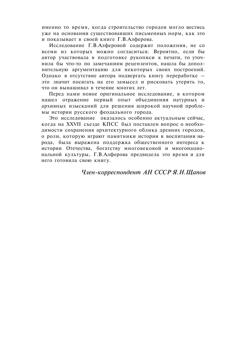 Алферова Г.В. Русские города XVI-XVII веков/Ин-т истории СССР АН СССР; ЦНИИ теории иистории архитектуры. М.: Стройиздат, 1989. Г.В.Алферова (1912 - 1984), более 20 лет изучавшая вопрос о возникновении городов в Российском государстве в XVI-XVII вв. , на основании источников, многие из которых впервые вводятся в научный оборот, выдвинула гипотезу, что в XVI-XVII вв. города строились по строго продуманному плану, опровергая сложившееся мнение о том, что до XVIII в. русские города возникали стихийно.На основании анализа художественного строя городов XVI-XVII вв. автор утверждает, что уровень русского градостроительного искусства этого периода был значительно выше, чем считалось до сих пор, и поэтому при современной реконструкции таких городов, следует учитывать их первоначальный облик и разумно сочетать новое строительство со старым.