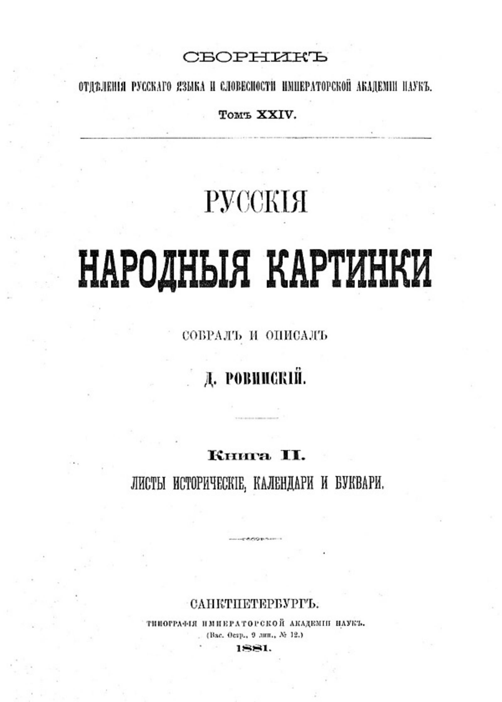 Ровинский, Дмитрий Александрович, (1824–1895). Русские народные картинки. Кн. 2. Листы исторические, календари и буквари / Собрал и описал Д. Ровинский. — Типография Императорской Академии Наук, 1881. — 530 с.