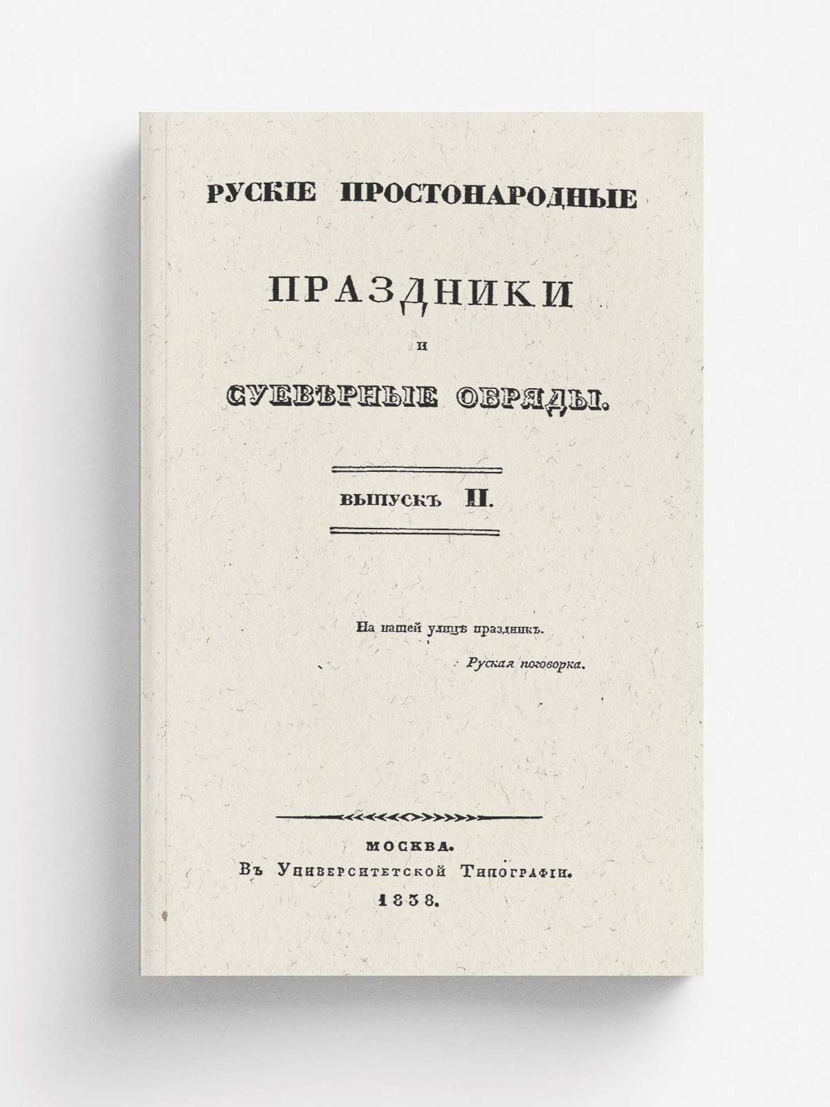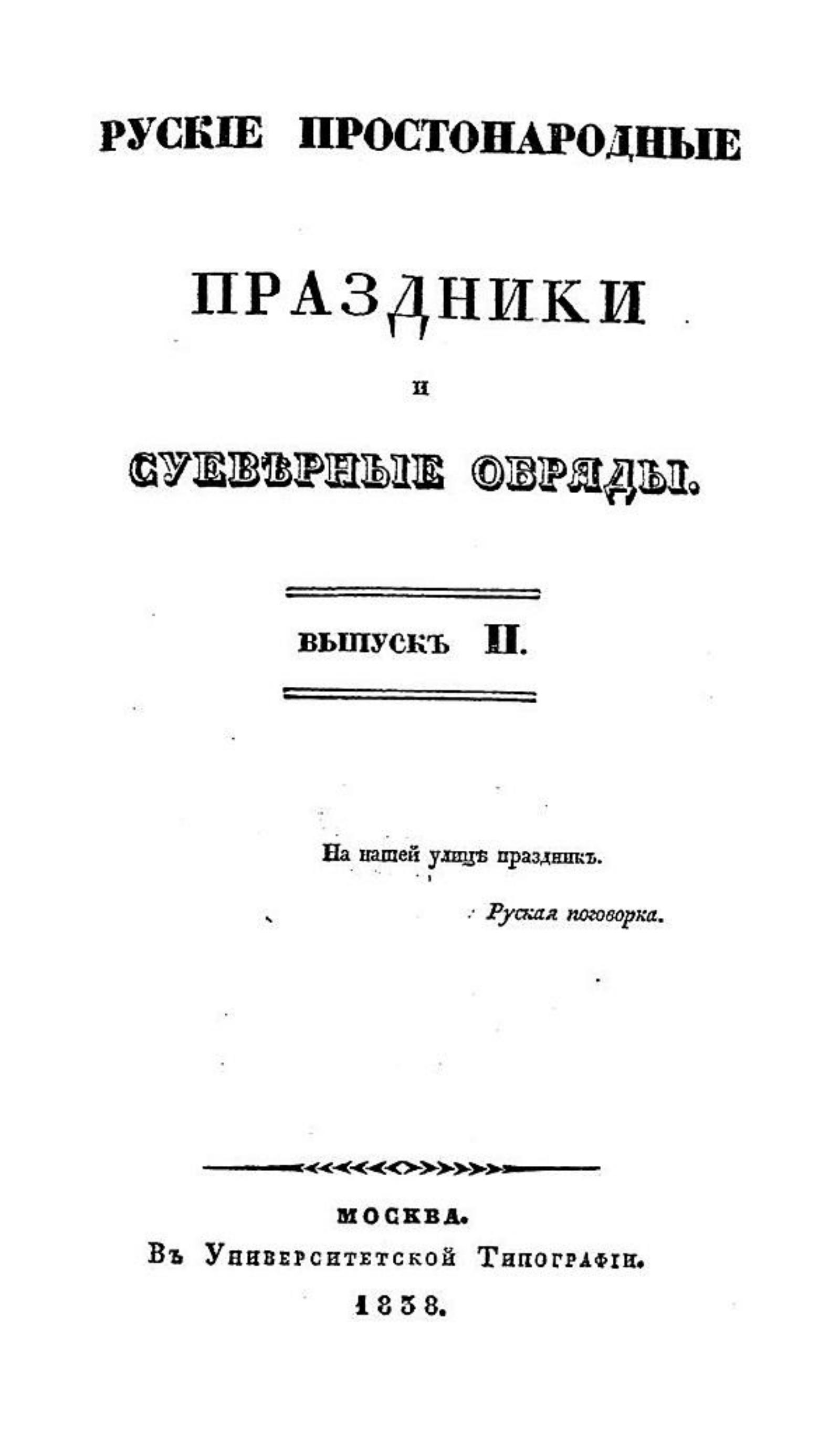 Русские простонародные праздники и суеверные обряды. Вып. 2. — В университетской типографии, 1838. — 142 с.