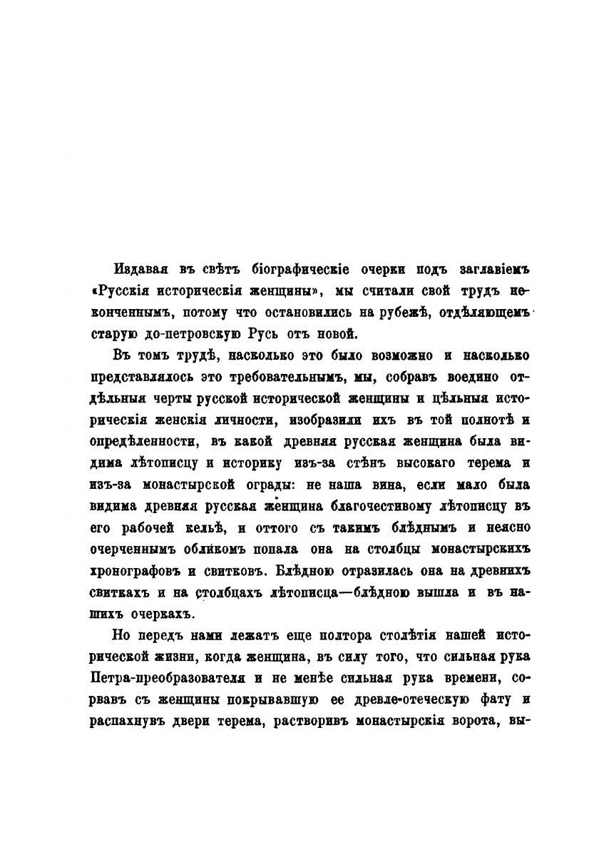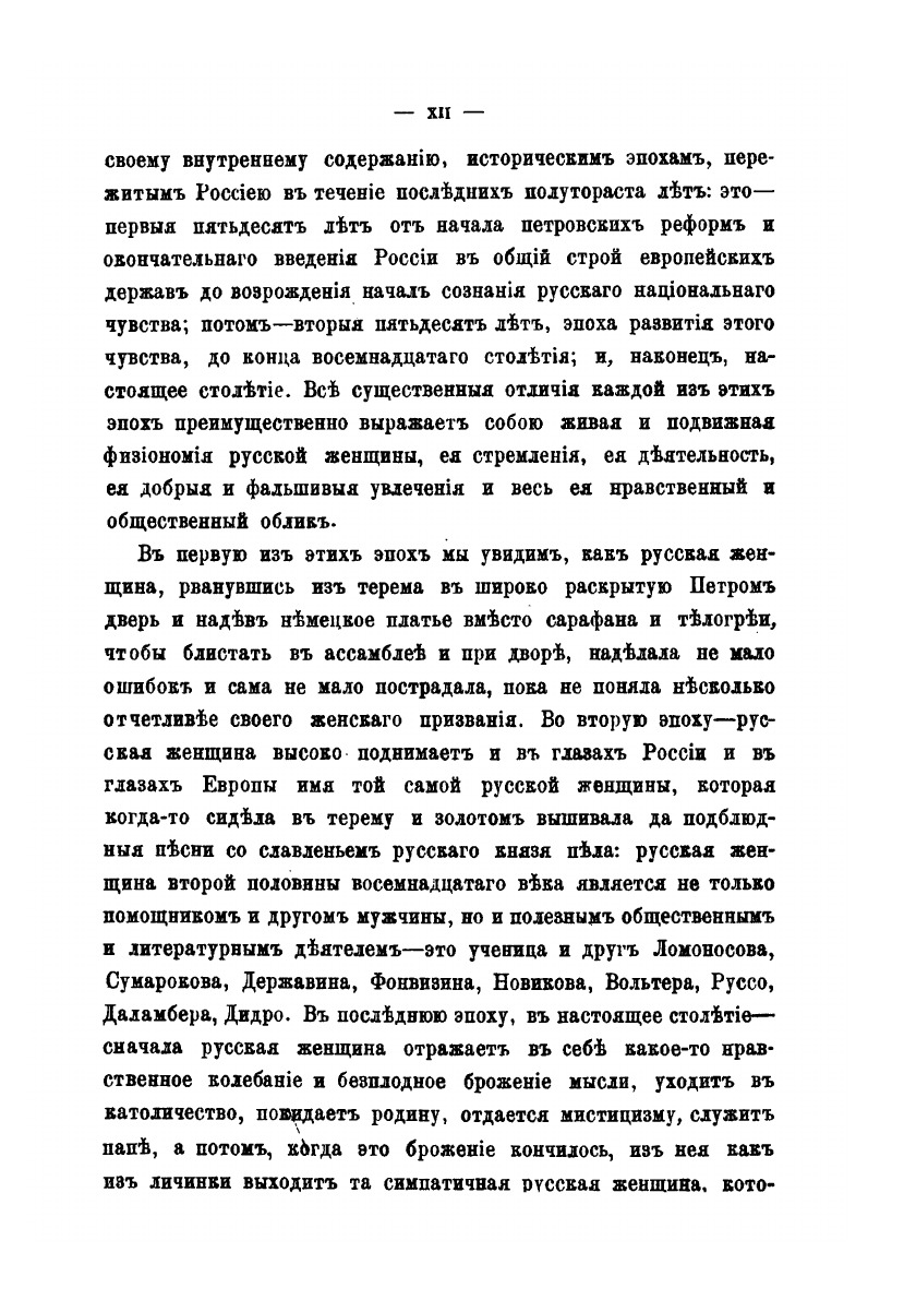 По мнению автора книги, история русской женщины не только пополняет русскую историю вообще, но и уясняет её больше, чем вся сумма прочих исторических материалов. Каков характер и направление исторической эпохи, такой является и женщина едва ли не исключительнее, чем мужчина.Труд Д. Мордовцева состоит из трёх частей – сообразно трём заметно друг от друга отличающимся историческим эпохам. Это первые пятьдесят лет от начала петровских реформ и окончательного введения России в общий строй европейских держав до возрождения начал сознания русского национального чувства; вторые пятьдесят лет – эпоха развития этого чувства – до конца восемнадцатого столетия; девятнадцатое столетие.Настоящая книга посвящена женщине первой половины восемнадцатого века. Читатель увидит, как русская женщина, «рванувшись из терема в широко раскрытую Петром дверь и надев немецкое платье вместо сарафана и телогреи, чтобы блистать в ассамблее и при дворе, наделала немало ошибок и сама немало пострадала, пока не поняла несколько отчётливее своего женского призвания». – Книга включает девятнадцать биографий.