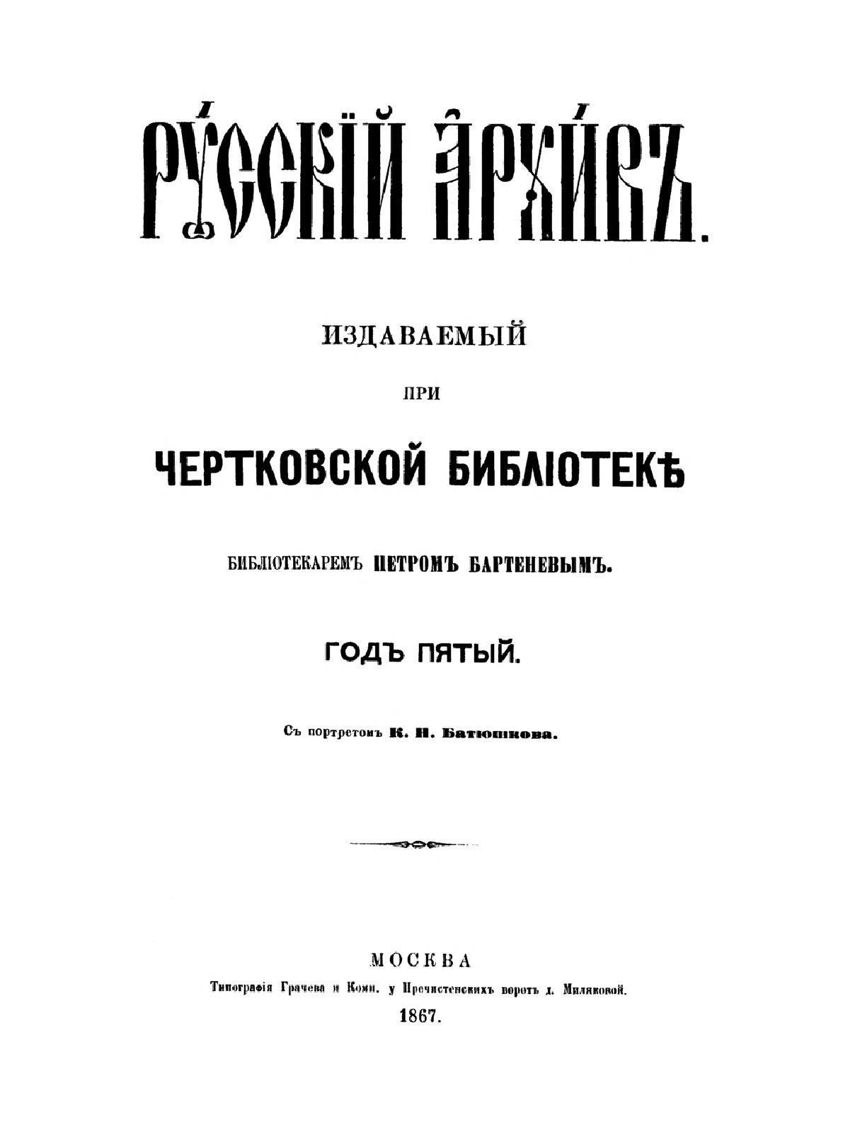 «Русский архив» ежемесячный историко-литературный журнал, издававшийся в Москве с 1863 по 1917 год. Создателем и продолжительные годы редактором журнала был П. И. Бартенев историк, археограф, библиограф. Этот журнал называли «живой картиной былого», поскольку он содержал преимущественно публикации неизданных мемуарных, эпистолярных, литературно-художественных и ведомственных документальных материалов, освещавших культурную и политическую историю России в XVIII и XIX вв. По числу опубликованных источников «Русский архив» стоит на первом месте среди русских исторических журналов. В течение полувека П. И. Бартенев издавал журнал, сумел много написать, опубликовать, открыть множество неизвестных источников. Служба П. И. Бартенева в Архиве министерства иностранных дел, поездки заграницу, работа в Чертковской библиотеке позволили редактору познакомиться с разнообразными материалами по истории России. Интересен факт, что именно П. И. Бартенев подбирал исторический материал для романа "Война и мир".Когда известный граф М. С. Воронцов пригласил П. И. Бартенева издать семейный архив Воронцовых, историк познакомился с его женой, Елизаветой Ксаверьевной, услышал от нее много интересных рассказов о Пушкине. Впоследствии в разных журналах, в том числе и в «Русском архиве» были опубликованы статьи П. И. Бартенева, посвященные Пушкину, которые легли в основу будущих исследований пушкинистов, биографов, краеведов, изучавших его творчество. На страницах журнала были опубликованы произведения русских писателей и поэтов: В. А. Жуковского М. Ю. Лермонтова, Н. М. Карамзина, Н. В. Гоголя. Среди редких исторических документов в «Русском архиве» были опубликованы материалы об Отечественной войне 1812 года (1890), записки и письма декабристов (во многих книжках «Русского архива» различных годов).
