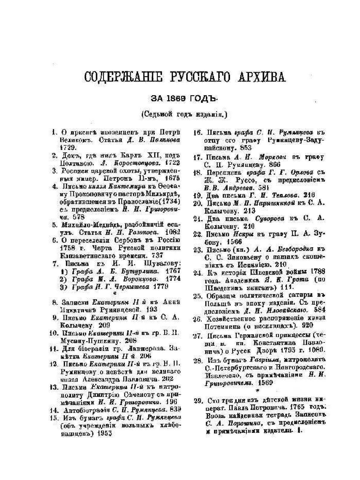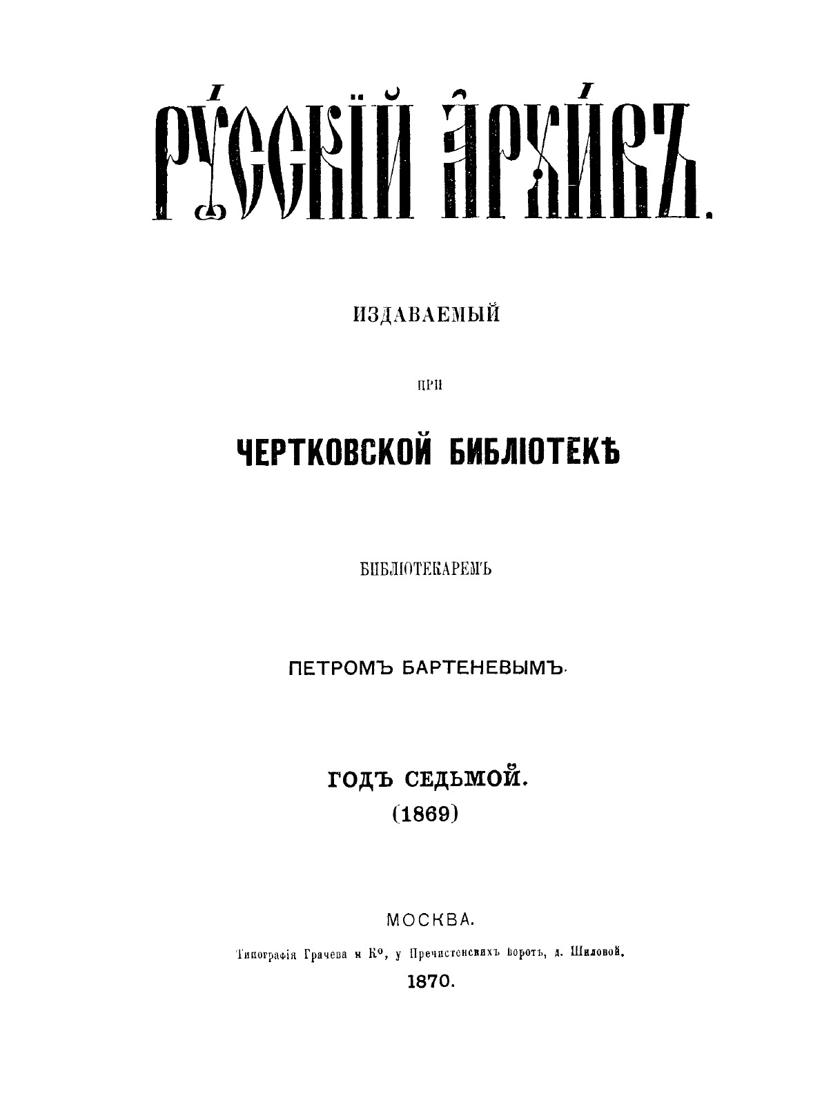 «Русский архив» — ежемесячный историко-литературный журнал, издававшийся в Москве с 1863 по 1917 год. Создателем и продолжительные годы редактором журнала был П. И. Бартенев – историк, археограф, библиограф. Этот журнал называли «живой картиной былого», поскольку он содержал преимущественно публикации неизданных мемуарных, эпистолярных, литературно-художественных и ведомственных документальных материалов, освещавших культурную и политическую историю России в XVIII и XIX вв. По числу опубликованных источников «Русский архив» стоит на первом месте среди русских исторических журналов. В течение полувека П. И. Бартенев издавал журнал, сумел много написать, опубликовать, открыть множество неизвестных источников. Служба П. И. Бартенева в Архиве министерства иностранных дел, поездки заграницу, работа в Чертковской библиотеке позволили редактору познакомиться с разнообразными материалами по истории России. Интересен факт, что именно П. И. Бартенев подбирал исторический материал для романа "Война и мир".Когда известный граф М. С. Воронцов пригласил П. И. Бартенева издать семейный архив Воронцовых, историк познакомился с его женой, Елизаветой Ксаверьевной, услышал от нее много интересных рассказов о Пушкине. Впоследствии в разных журналах, в том числе и в «Русском архиве» были опубликованы статьи П. И. Бартенева, посвященные Пушкину, которые легли в основу будущих исследований пушкинистов, биографов, краеведов, изучавших его творчество. На страницах журнала были опубликованы произведения русских писателей и поэтов: В. А. Жуковского М. Ю. Лермонтова, Н. М. Карамзина, Н. В. Гоголя. Среди редких исторических документов в «Русском архиве» были опубликованы материалы об Отечественной войне 1812 года (1890), записки и письма декабристов (во многих книжках «Русского архива» различных годов).