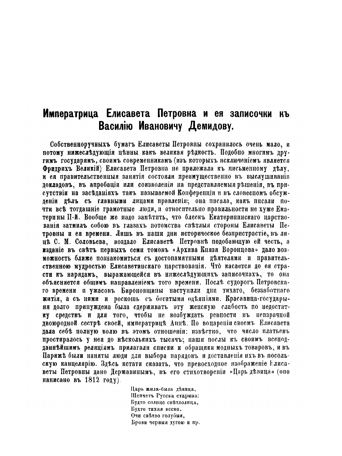 «Русский архив» — ежемесячный историко-литературный журнал, издававшийся в Москве с 1863 по 1917 год. Создателем и продолжительные годы редактором журнала был П. И. Бартенев – историк, археограф, библиограф. Этот журнал называли «живой картиной былого», поскольку он содержал преимущественно публикации неизданных мемуарных, эпистолярных, литературно-художественных и ведомственных документальных материалов, освещавших культурную и политическую историю России в XVIII и XIX вв. По числу опубликованных источников «Русский архив» стоит на первом месте среди русских исторических журналов. В течение полувека П. И. Бартенев издавал журнал, сумел много написать, опубликовать, открыть множество неизвестных источников. Служба П. И. Бартенева в Архиве министерства иностранных дел, поездки заграницу, работа в Чертковской библиотеке позволили редактору познакомиться с разнообразными материалами по истории России. Интересен факт, что именно П. И. Бартенев подбирал исторический материал для романа "Война и мир".Когда известный граф М. С. Воронцов пригласил П. И. Бартенева издать семейный архив Воронцовых, историк познакомился с его женой, Елизаветой Ксаверьевной, услышал от нее много интересных рассказов о Пушкине. Впоследствии в разных журналах, в том числе и в «Русском архиве» были опубликованы статьи П. И. Бартенева, посвященные Пушкину, которые легли в основу будущих исследований пушкинистов, биографов, краеведов, изучавших его творчество. На страницах журнала были опубликованы произведения русских писателей и поэтов: В. А. Жуковского М. Ю. Лермонтова, Н. М. Карамзина, Н. В. Гоголя. Среди редких исторических документов в «Русском архиве» были опубликованы материалы об Отечественной войне 1812 года (1890), записки и письма декабристов (во многих книжках «Русского архива» различных годов).