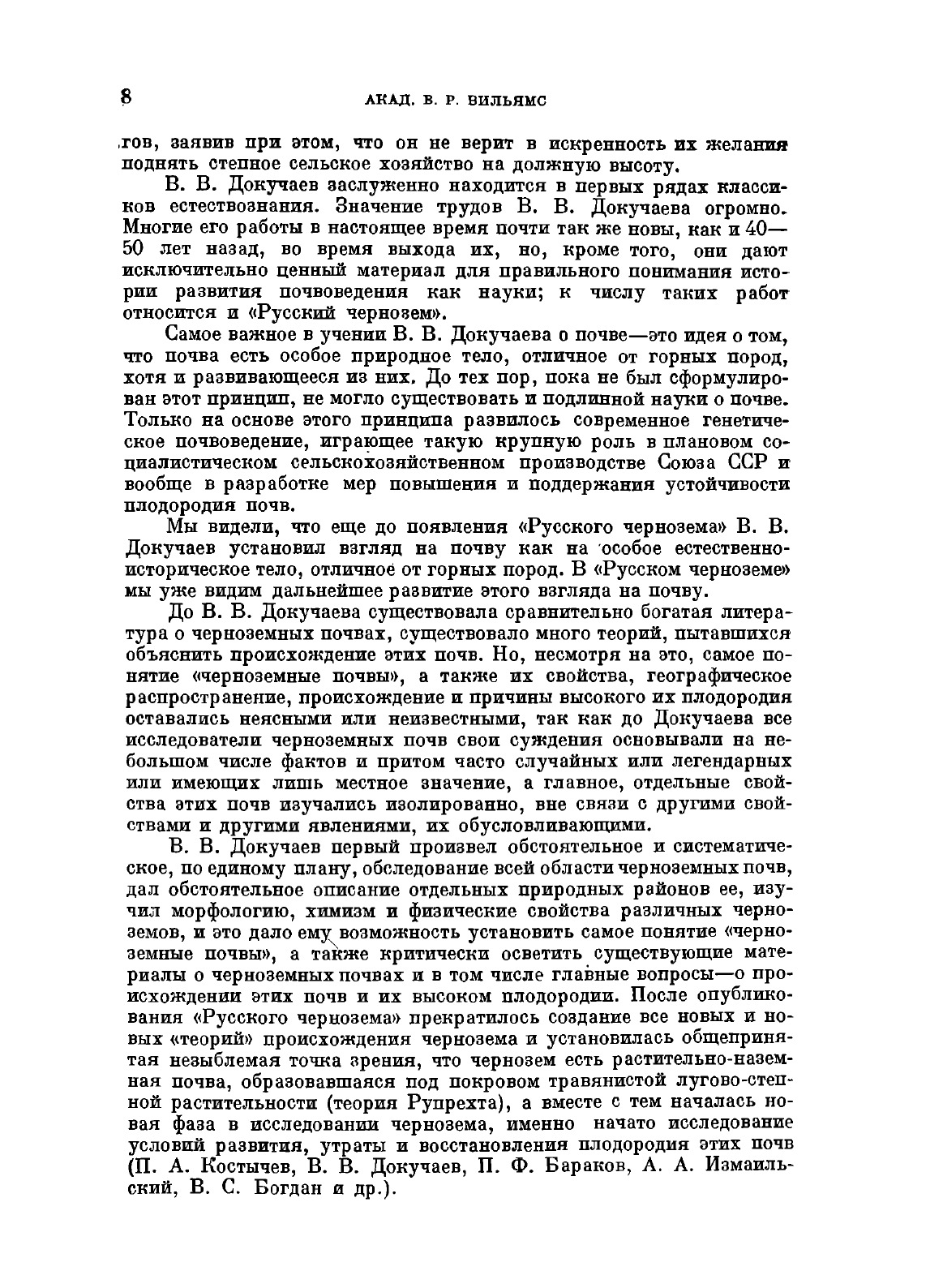 Докучаев Василий Васильевич принадлежит к числу наиболее выдающихся ученых конца XIX столетия, ученых, имеющих мировое значение. Его трудами положено начало той огромной и важной отрасли нашего знания, которая известна под именем генетического почвоведения. Нельзя представлять себе дело так, что до В. В. Докучаева никаких знаний, никакой науки о почве не существовало, что В. В. Докучаев основал совершенно новую отрасль человеческого знания, не существовавшую до него. До В. В. Докучаева накоплено было огромное количество разнообразных сведений о почвах и их плодородии. Над исследованием почв раньше В. В. Докучаева работали такие крупные силы, как Фаллу, Паллас, Либих, Мурчисон, Эйхвальд, Шлезинг, Дегерен, Шюблер, Вольни и др. Но лишь Докучаев оказал огромное влияние на развитие сложного цикла естественных наук и практических мероприятий по развитию сельского хозяйства.