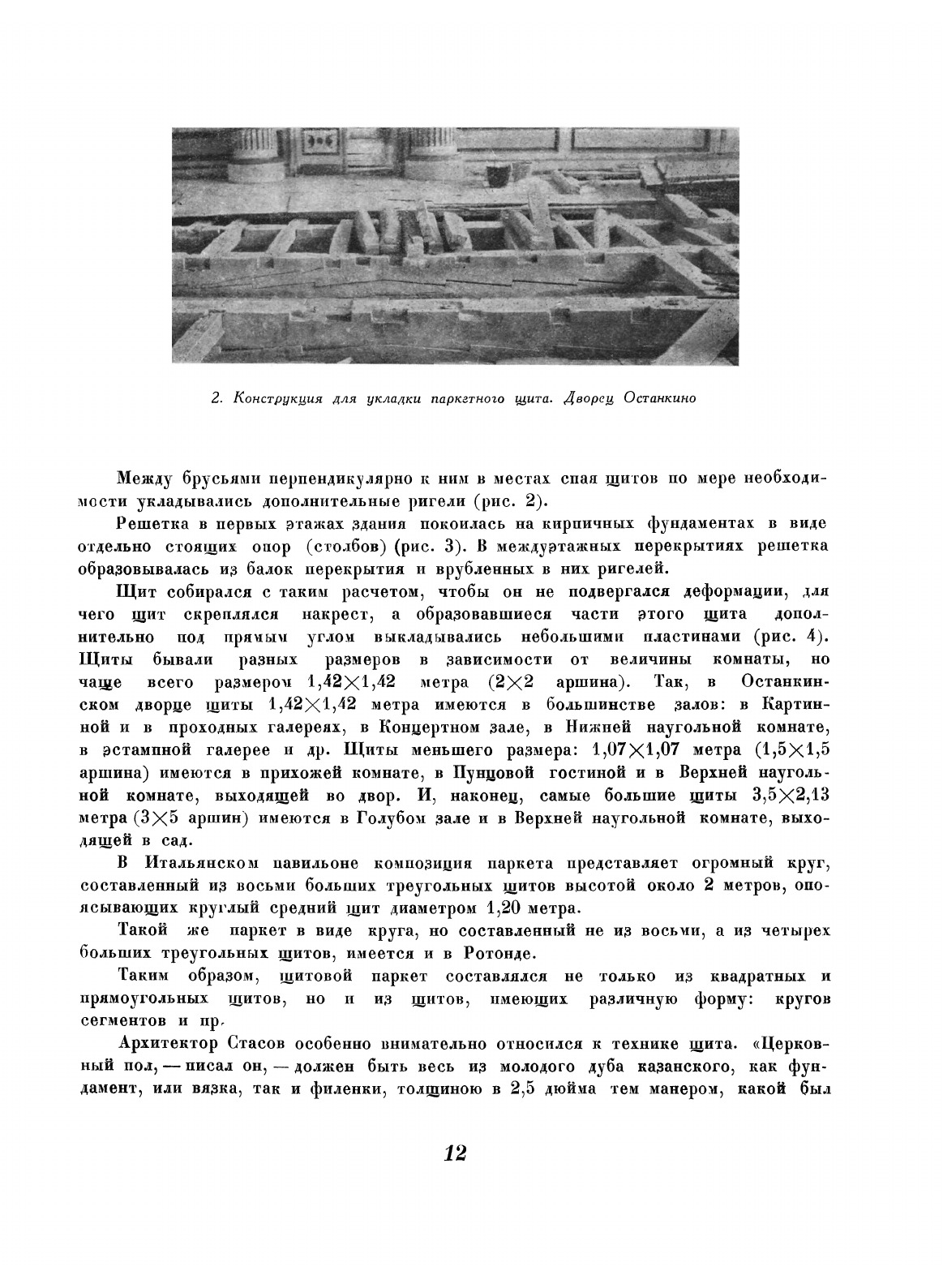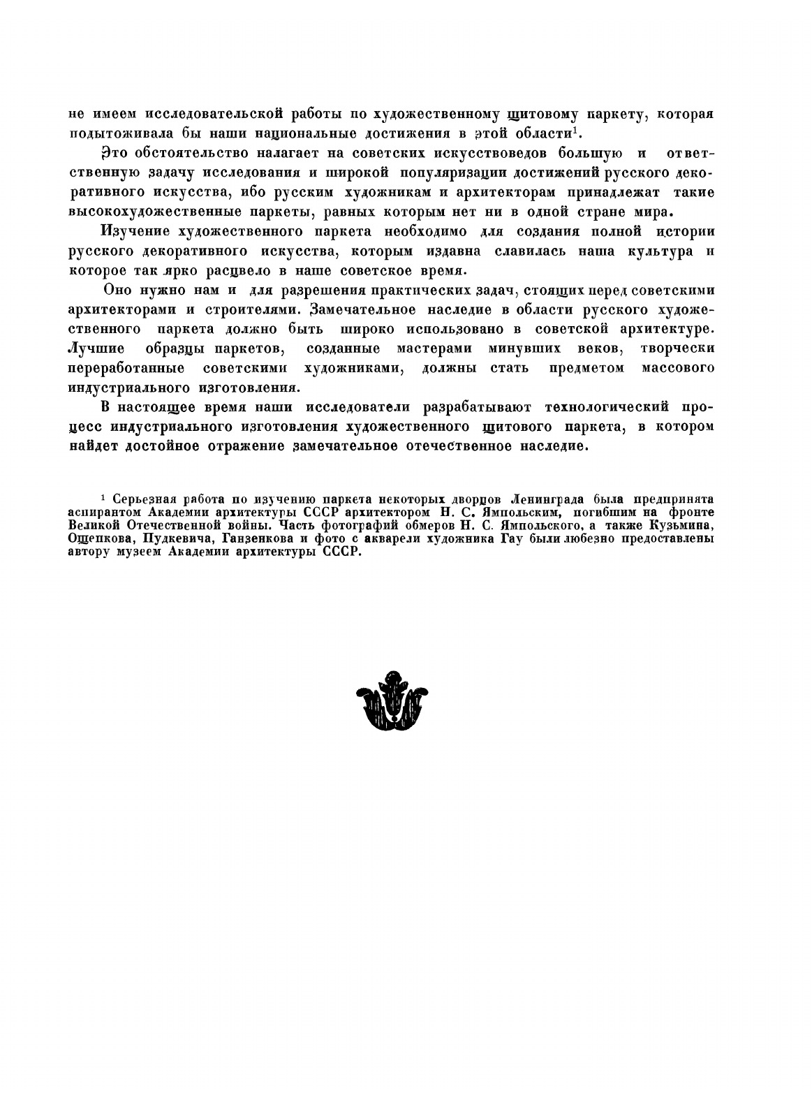 Книга проф. К.А. Соловьева - первый значительный труд, посвященный русскому художественному паркету. В ней широко использован материал архивов и дан богатый подбор образцов паркета XVIII и XIX вв. Многие из этих образцов погибли в годы Великой Отечественной войны. Книга ставит своей задачей показать высокое искусство русских мастеров этой эпохи и кладет основу изучения русского художественного паркета и его использования в советских общественных и жилых зданиях. Настоящая работа является седьмым выпуском трудов Останкинского дворца-музея.