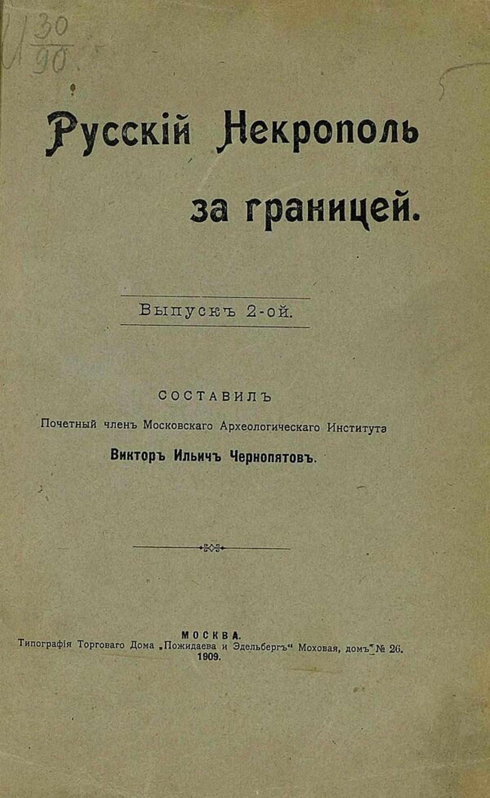 Чернопятов, Виктор Ильич (1857–1935). Русский некрополь за границей. — Москва : Тип. Московскаго ун-та, [1908–1913]. Вып. 2. — 1909. — 47, [2] с.