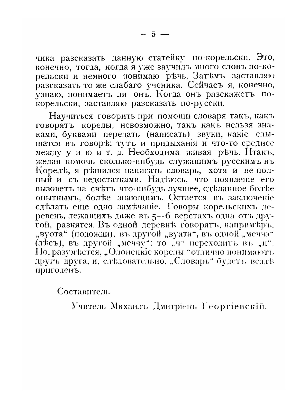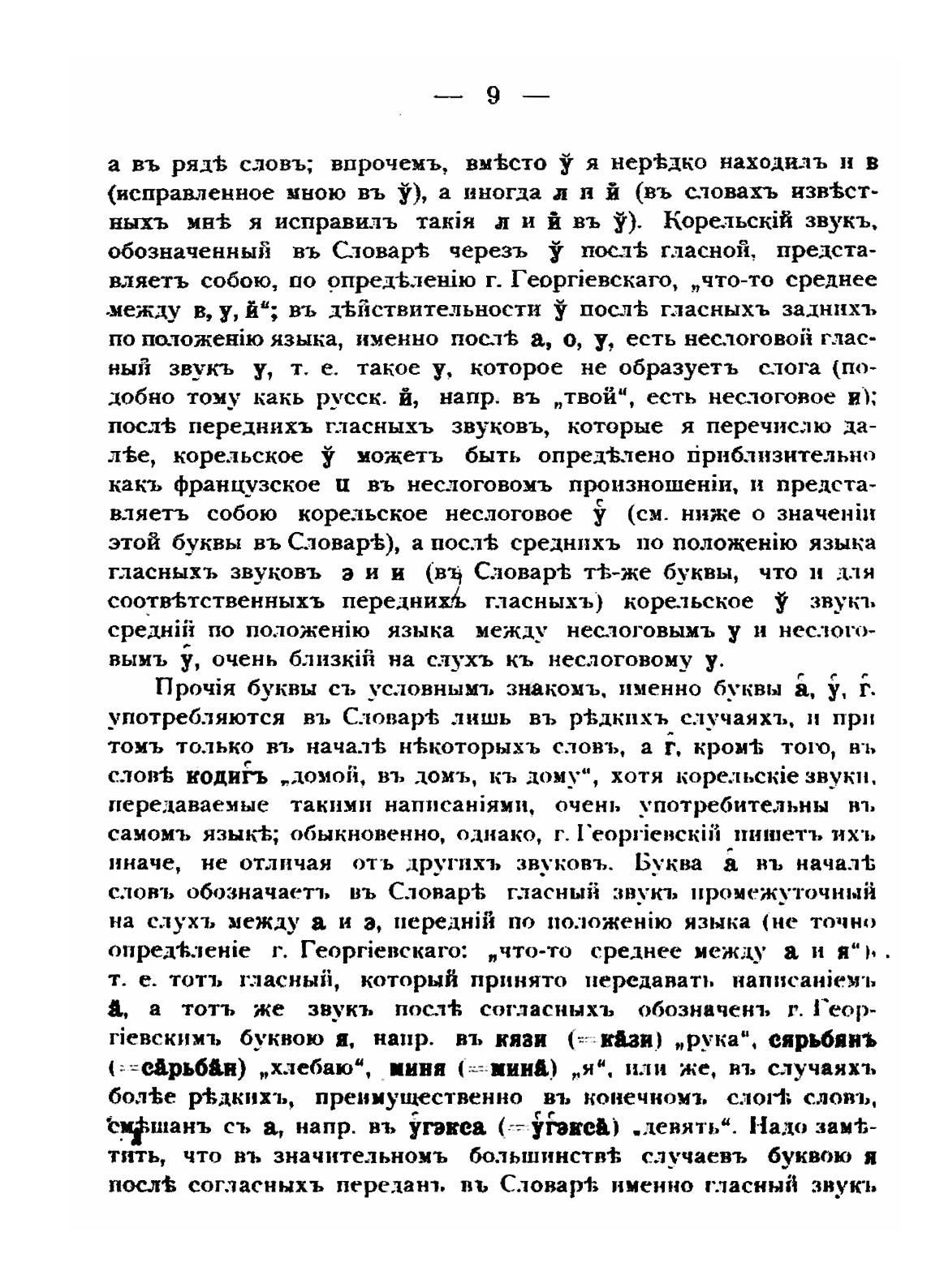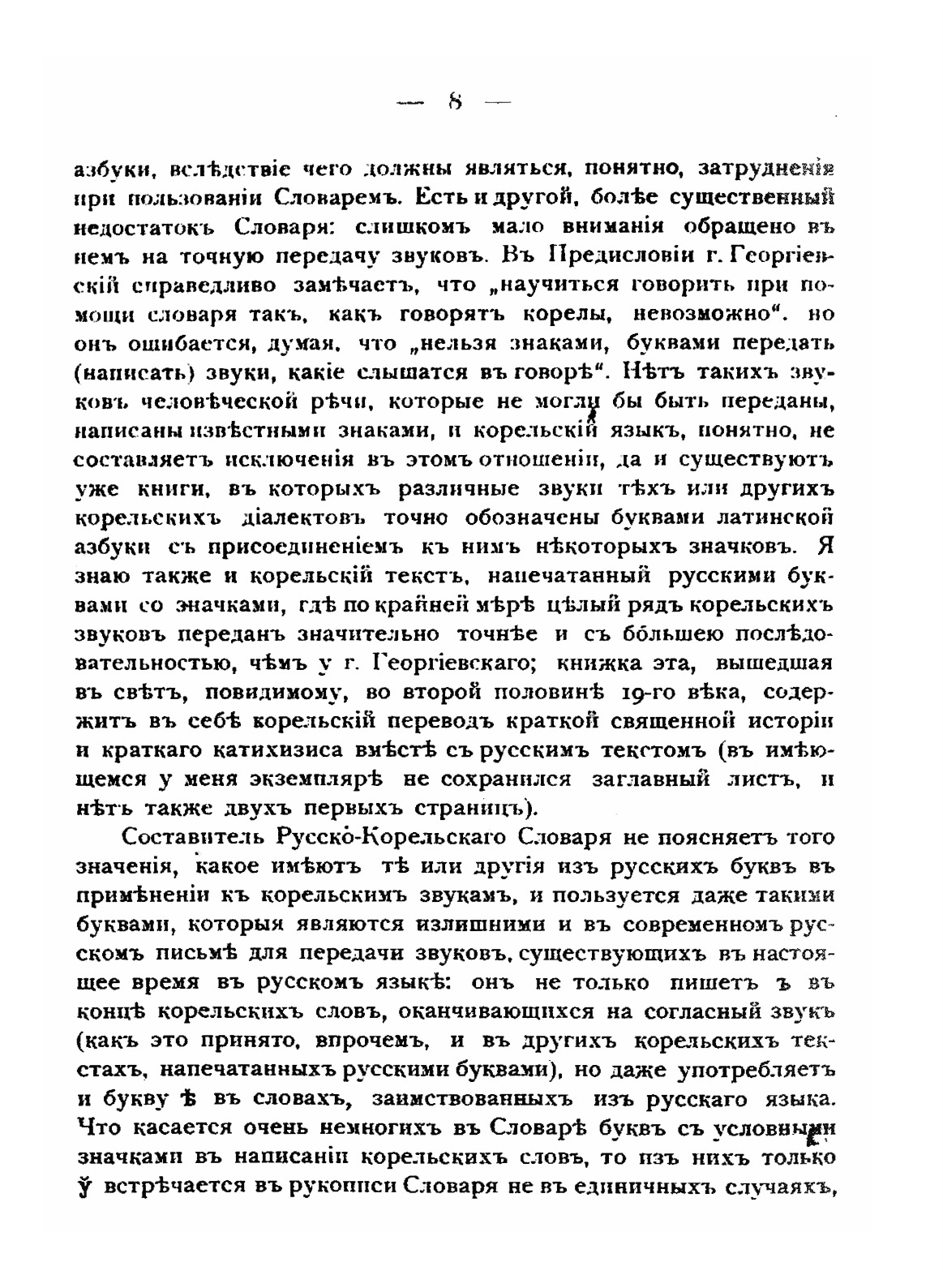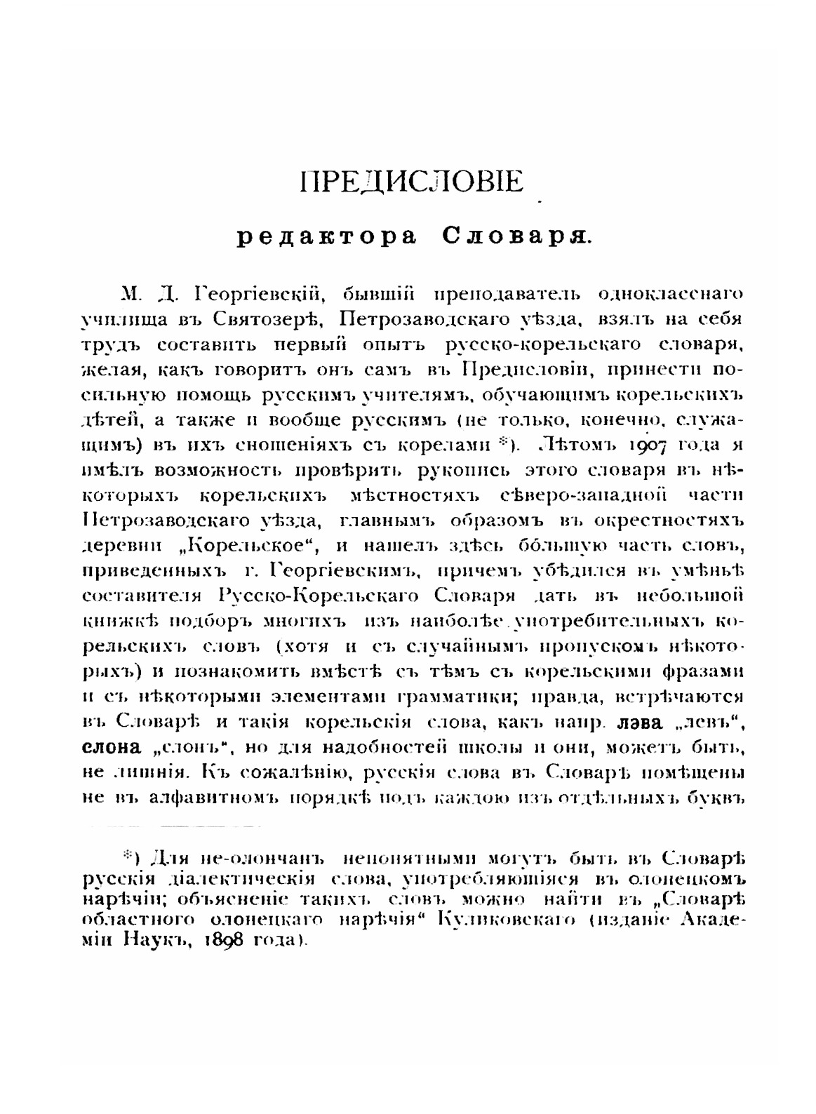 До 90-х годов ХХ века карельская письменность была развита слабо, причем на её развитие влияли «разнонаправленные» усилия: деятельность православной церкви, русских, финских лингвистов. В книгоиздании использовали как кириллический шрифт, так и латинский.Данный словарь составлен учителем Святозерского одноклассного училища М. Д. Георгиевским для нужд учителей и служащих, работавших в Карелии, поэтому из практических соображений карельские слова приводятся на кириллице. И автор и редактор признают что в ряде случаев кириллица не совсем правильно передает фонетические особенности карельского языка, поэтому в предисловии приведены некоторые примечания к чтению карельской части словаря.